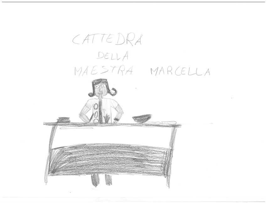 Classroom drawing: the presence of the teacher: “The Teacher Marcella and her desk.” Female, 10 years old.