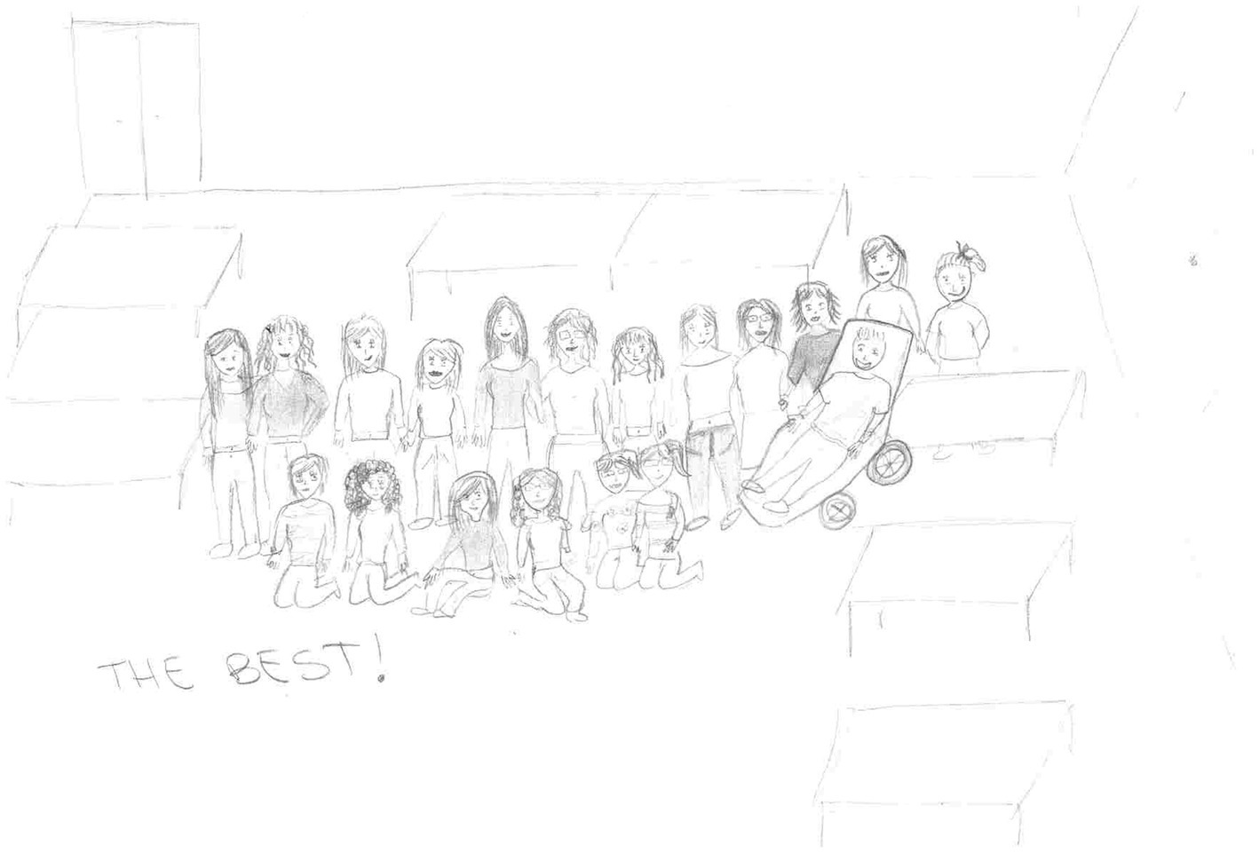 Classroom drawing: Group class and teachers. The drawer, the classmates, and the teacher. Integration 3. Female, 12 years old.
