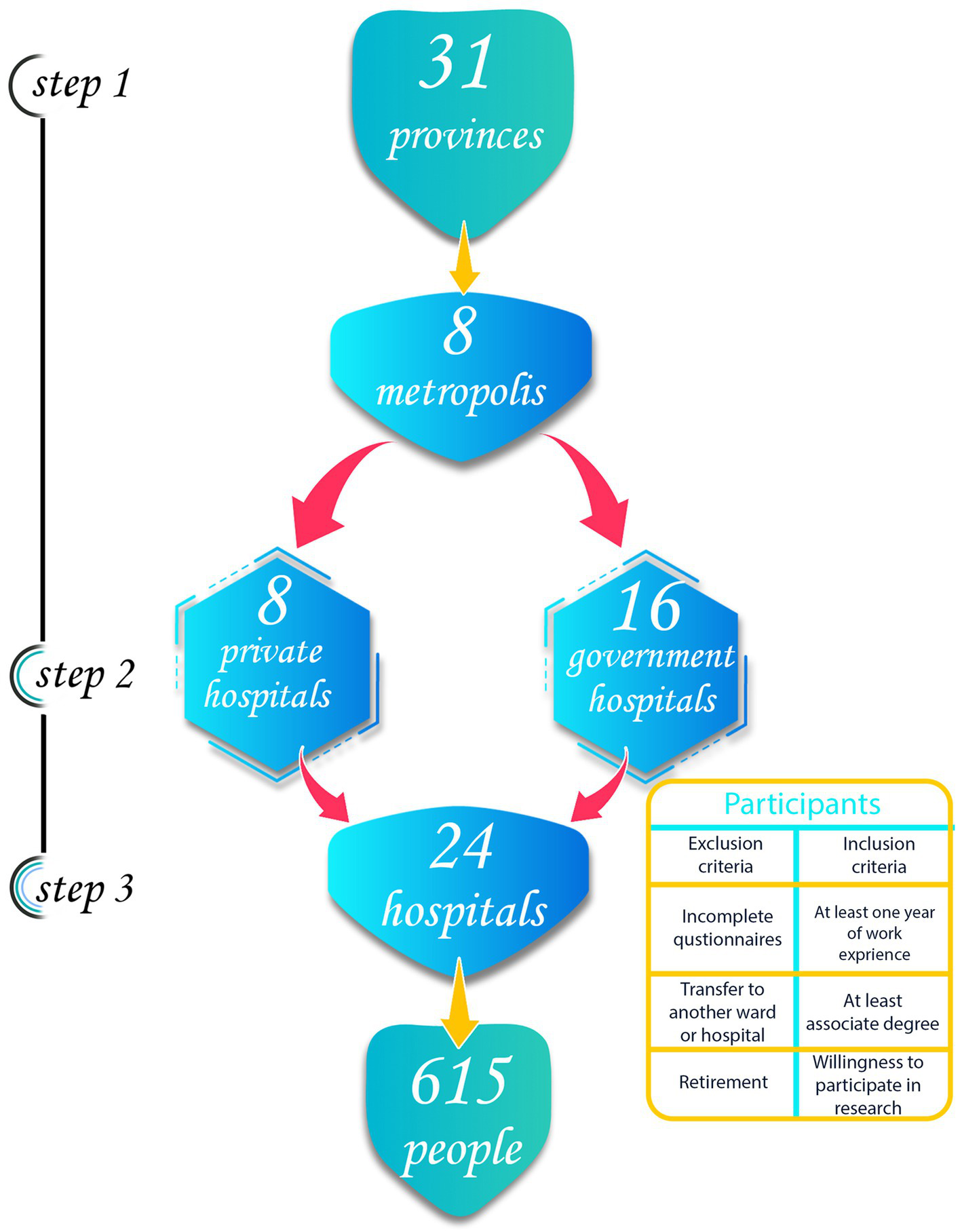 The sampling method in this study was multistage (Figure 1). First, 8 metropolises were selected among 31 provinces by simple random method (using lottery). Next, based on the type of hospital (private/public hospital), 2 hospitals (1 public hospital and 1 private hospital) were selected. Then, in these hospitals, based on the number of surgical technologists in the operating room, people were selected in a stratified manner through identification numbers. The link of the online questionnaires was sent to them through social networks (WhatsApp and Telegram). Follow-up of people to answer was done up to 3 times, and if they did not want to cooperate in the study, the next random number was selected. Inclusion criteria included at least an associate’s degree in surgical technology and more than 1 year of work experience in the operating room and willingness to participate in the study. Exclusion criteria were incompleted the questionnaires, and transfer to another hospital or retirement.