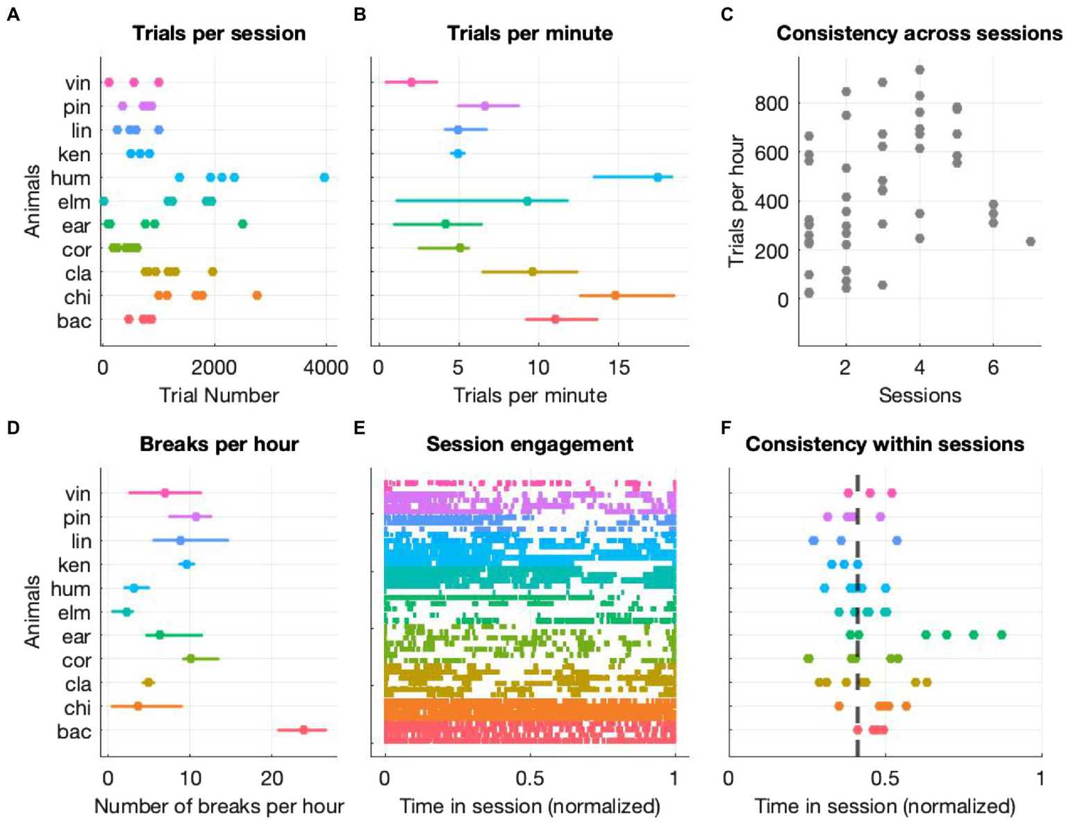We assessed cognitive flexibility of 26 participants (25 humans and 11 macaque monkeys) with a custom-made, touchscreen-based task that combines design elements of classical reversal-learning and set-shifting procedures. In order to assess cognitive flexibility of humans and monkeys on a non-binary set of rules, we employed motion along with color and shape as feature dimensions. Given that motion has never been used in this context before, we also structured our task in a way that rule changes would automatically occur after repeated interactions at chance level. This was instrumental to prevent participants (especially animals) from being stuck at potentially difficult rules. We started by determining the animals’ level of general engagement in the experimental sessions. We looked at number of trials per session and per minute, the time at which the most engagement took place and the number and length of breaks (defined as an inter-trial-interval of more than 30 s), and included all stages regardless of them being completed following the rule or by chance. Figure 2 depicts the animals’ level of general engagement to be taken as a description of the conditions under which the cognitive assessment was carried out. Although the levels of interaction, as quantified by the number of trials performed per session (Figure 2A) and per minute (Figure 2B) and the number of breaks per hour (Figure 2D) were variable across animals, each animal had a consistent interaction level within and across sessions (Figures 2C,E,F). We have performed a similar analysis for humans to determine their general engagement level as well (Supplementary Figure S2).