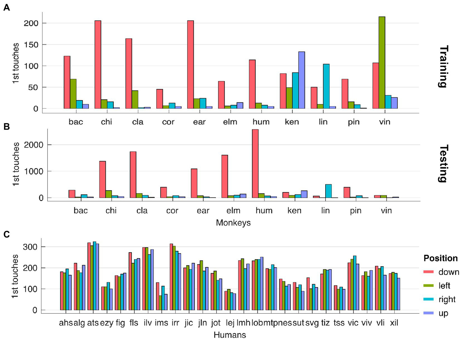 Figure 3. (A) Side bias for monkeys in testing stages. (B) Side bias for humans in testing stages. (C) Side bias for monkeys in training stages.