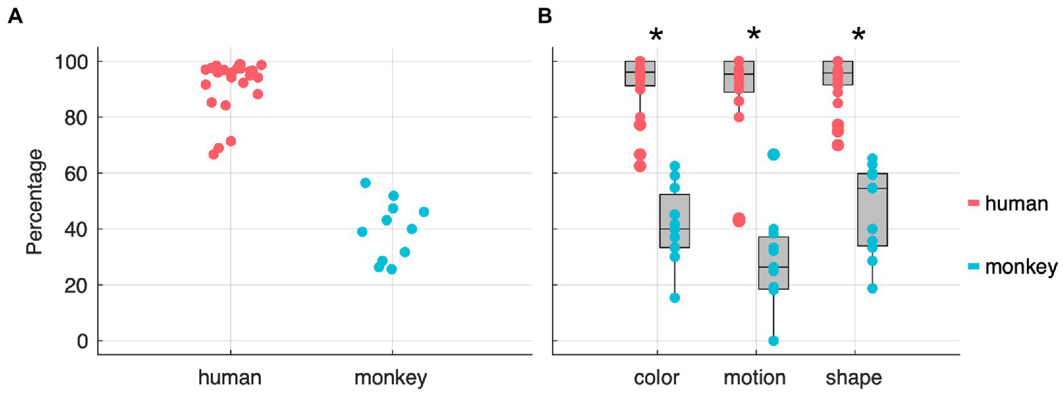 Human participants were tested in a dedicated psychophysics setup at the Cognitive Neuroscience Laboratory at the German Primate Center, for a single session. They underwent the same procedure as the animals, with the difference that human participants used a mouse instead of a touch screen and the start button in this case was placed in the middle of the screen. Animals were tested opportunistically and on consecutive downtime days from their main experimental routine (for an average of 6 sessions each lasting on average 121 min). During the testing, companion animals were not present or moved to a different section of the enclosure, while testing animals had access to the XBI from the main compartment of their home enclosure. Tested animals were always kept in their home enclosure in visual and acoustic contact with the conspecifics. On average, animals completed the training in the first 3 sessions and the testing continued on following days until data from at least 3 cycles from each feature dimension were collected (Figure 1E). We included in our analysis 11 out of 14 animals (2 animals did not complete the training and 1 animal did not interact with the device) and 25 out of 26 humans (due to technical issues during data collection for 1 participant). All analyses were performed using MATLAB (2020) and R version 4.x, R Core Team (2021) was used for GLM modeling, while the matlab package gramm (Morel, 2018) was used for plotting.