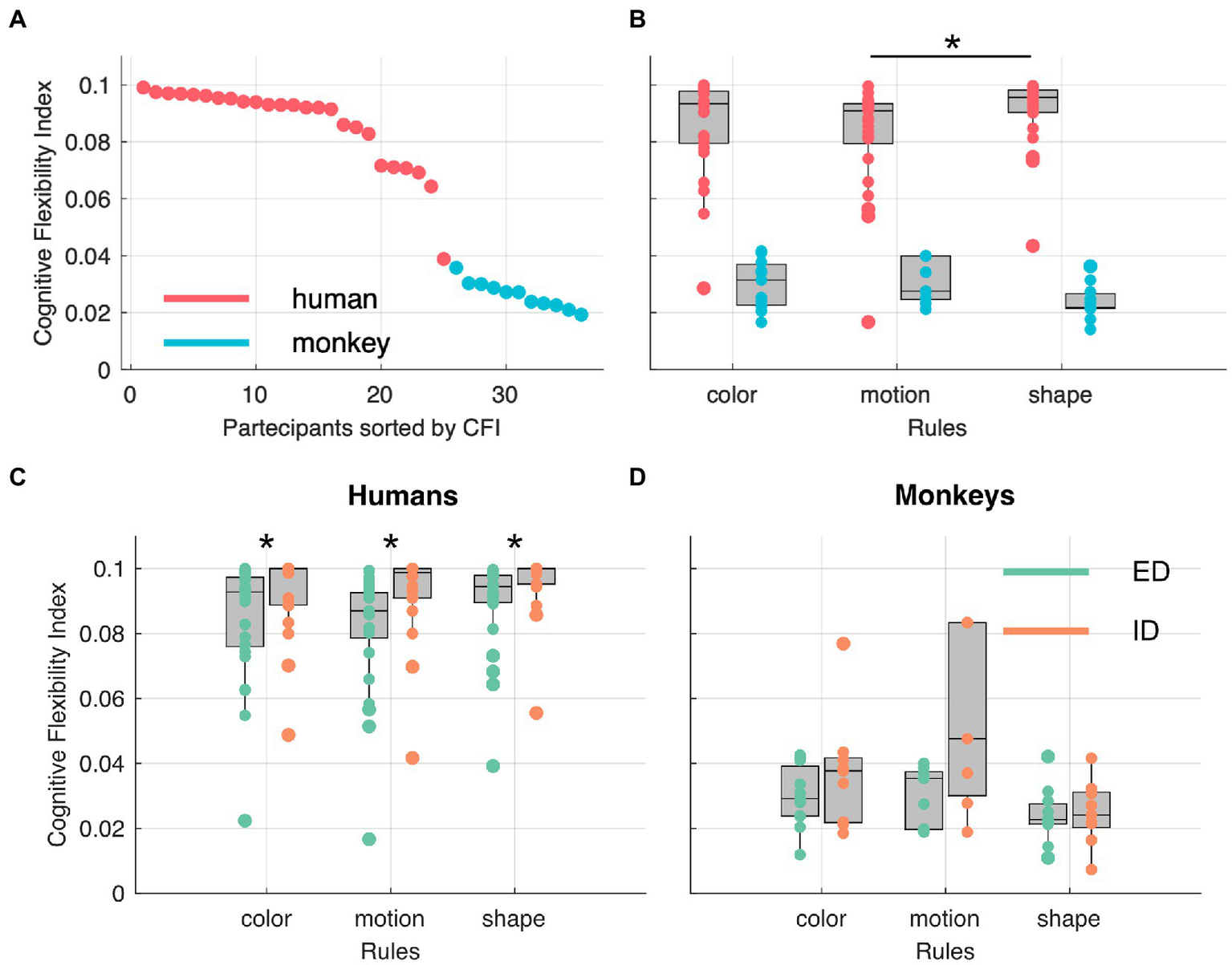 Figure 5. Participants sorted by cognitive flexibility index (CFI) across species (A) and rules (B). Star indicates statistical significance at a paired Wilcoxon rank sum test, with an alpha level of 0.0083 (corrected for multiple comparisons). (C,D) show CFI as function of rules in intra-dimensional (ID) and extra-dimensional (ED) shifts. Stars indicate statistical significance at a Wilcoxon rank sum, non-paired, two-sided test.