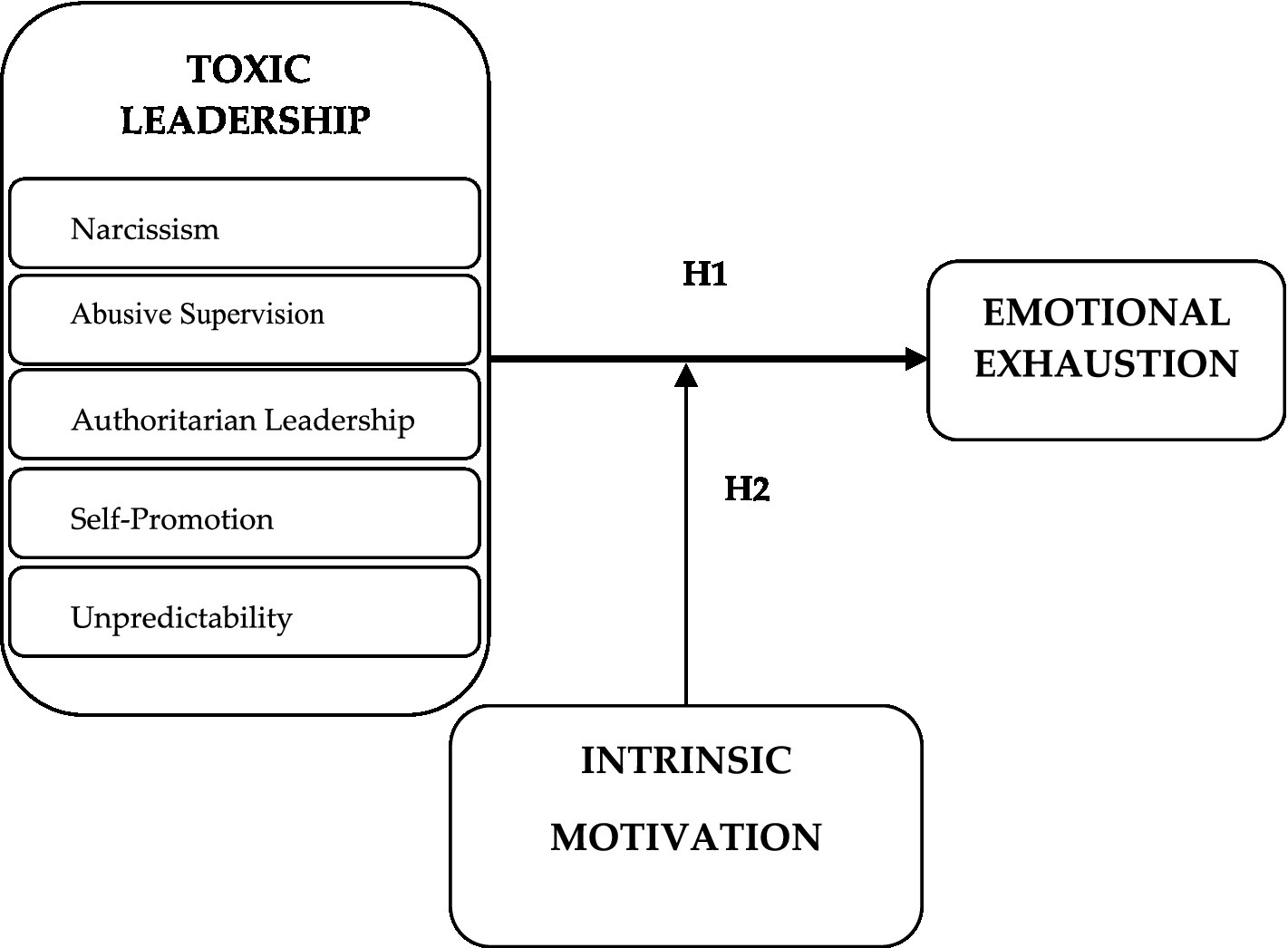 Self-determination theory also buffers the adverse effects of a hostile work atmosphere, such as mental and physical health problems and emotional exhaustion (Iso-Ahola and Park, 1996). Intrinsic motivation is widely accepted as an internal power to cope with emotional exhaustion (Kim, 2015). Thus, while toxic leadership creates a negative work atmosphere which ultimately leads to adverse consequences, intrinsic motivation may put barriers to the negative effects of toxic leadership. We expect employees with high intrinsic motivation to be more resilient to the negative reflections of toxic leadership, such as emotional exhaustion. Accordingly;