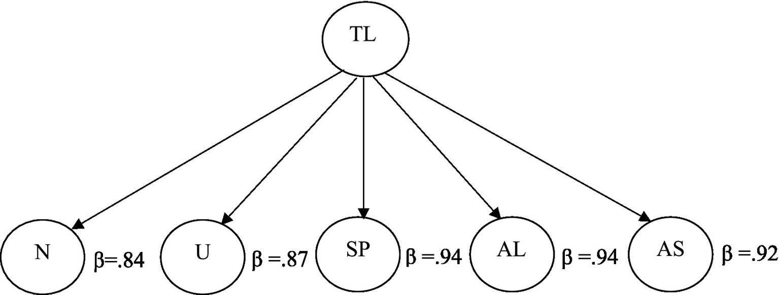 Second-order factor analysis of toxic leadership. TL, toxic leadership; N, narcissism; U, unpredictability; SP, self-promotion; AL, authoritarian leadership; AS, abusive supervision.