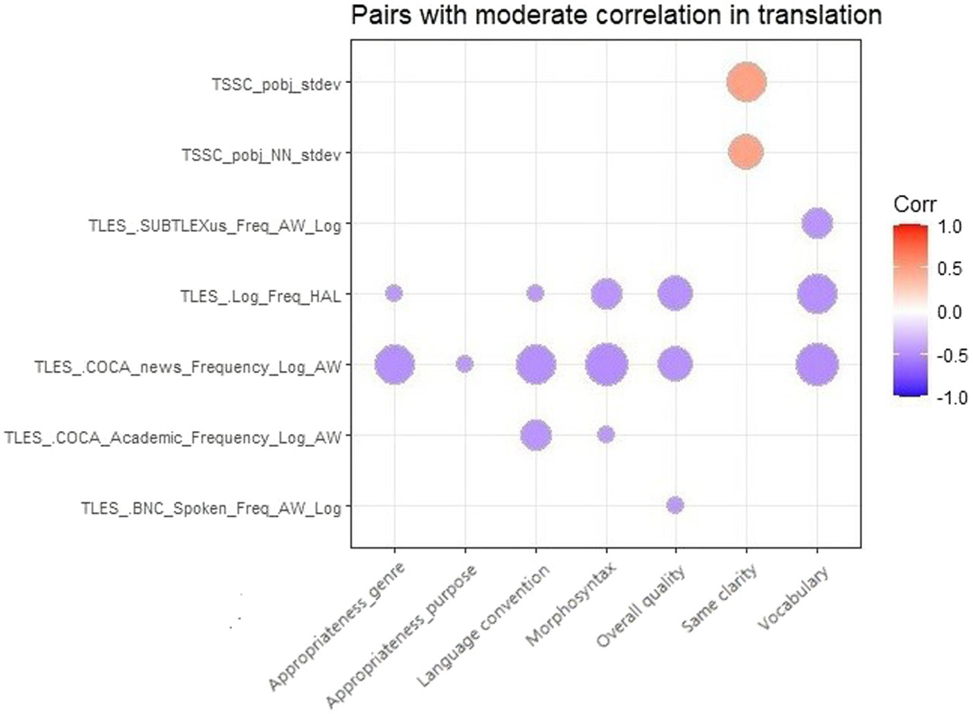 Overall, 1,393 pairs of NLP indices and quality metrics were correlated significantly. Figure 2 presents all 17 pairs reaching a moderate correlation. We referred to Wolf-Quintero et al. (1998) and adopted a moderate correlation with.450 < |r| < 0.650. Pairs with a larger circle size in the figure indicated a higher correlation coefficient. Results showed that five indicators of word frequency from TAALES exhibited negative correlations with the overall translation quality and the scores of analytical metrics in two dimensions, the composition of the target language and the achievement of communicative function. Particularly, the COCA_news_Frequency_ Log_AW and Log_Freq_HAL, which measure the mean frequency of words with reference to an English corpus in the news genre and a corpus of conversations to share information online, respectively, showed their close correlations with almost all the scores of analytical metrics. The remaining two indices from TAASSC revealed a positive correlation between the noun phrase (NP) variety of the text and the clarity of the text meaning.
