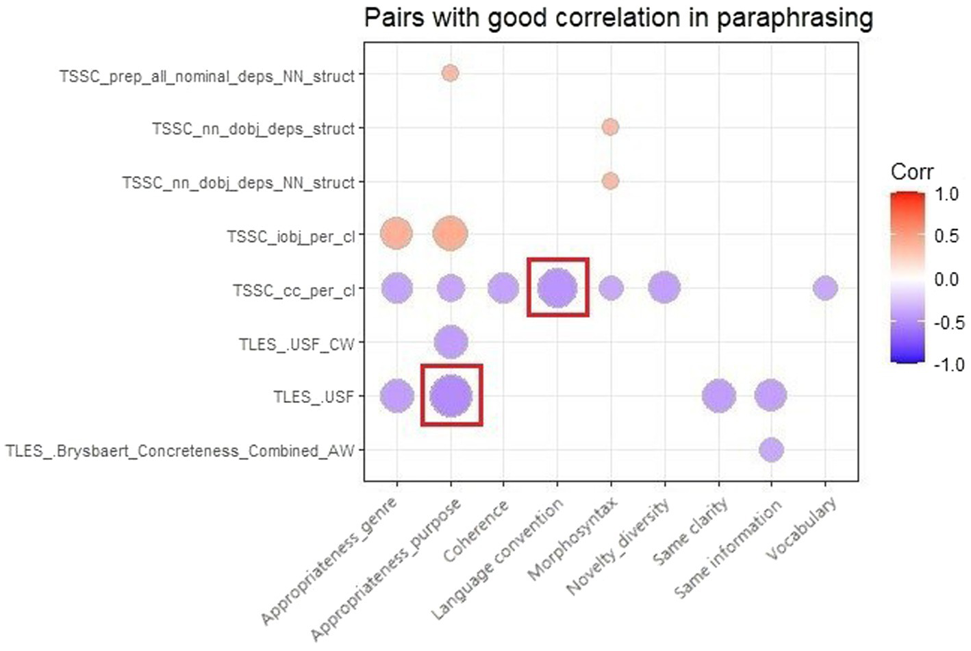 Generally speaking, the correlation between NLP indices and quality metrics in paraphrasing tended to be weaker than that in translation, as only 279 pairs were significant, and two of them reached a moderate correlation (see the results marked in Figure 3). To achieve a comparative analysis, we extracted the top 18 pairs with the strongest correlation (0.370 < |r| < 0.510), as is shown in Figure 3. Three indices from TAALES were negatively correlated with the paraphrasing quality. Specifically, word concreteness (Brysbaert_Concreteness_Combined_AW) was reported to be closely related to the performance of meaning expression. The contextual distinctiveness of words which measures the semantic diversity of their contexts (USF and USF_CW) revealed significant correlations with both the performance of meaning expression and achievement of communicative functions. As for the indices from TAASSC, a salient correlation was found between clause complexity (indicated by cc_per_cl and iobj_per_cl) and paraphrasing quality in terms of text composition and fulfillment of communicative effects. The remaining three indices representing the NP complexity were also positively correlated with the morphosyntactic-level language quality and the appropriateness of the communicative purpose.