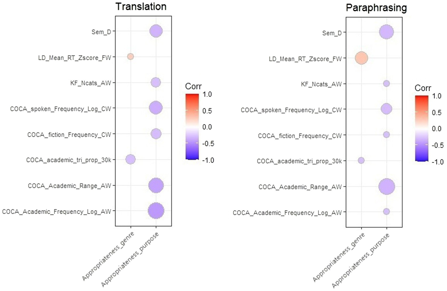 We further looked at the significantly correlated index-metric pairs shared in translation and paraphrasing. As is shown in Figure 4, all the indices were indicators of lexical sophistication from TAALES and were predictable in participants’ performance of communicative function achievement. Products containing more words with a longer reaction time (LD_Mean_RT_Zscore_FW) and more three-word collocations in a low frequency (COCA_academic_tri_prop_30k) led to a significant improvement in genre convention. Better achievements of the communicative effects were predicted by more words with lower frequency (COCA_Academic_Frequency_Log_AW, COCA_fiction_ Frequency_CW, COCA_ spoken_Frequency_Log_CW) and a more restricted range of use in documents (KF_Ncats_AW, COCA_Academic_Range_AW) and contexts (Sem_D).