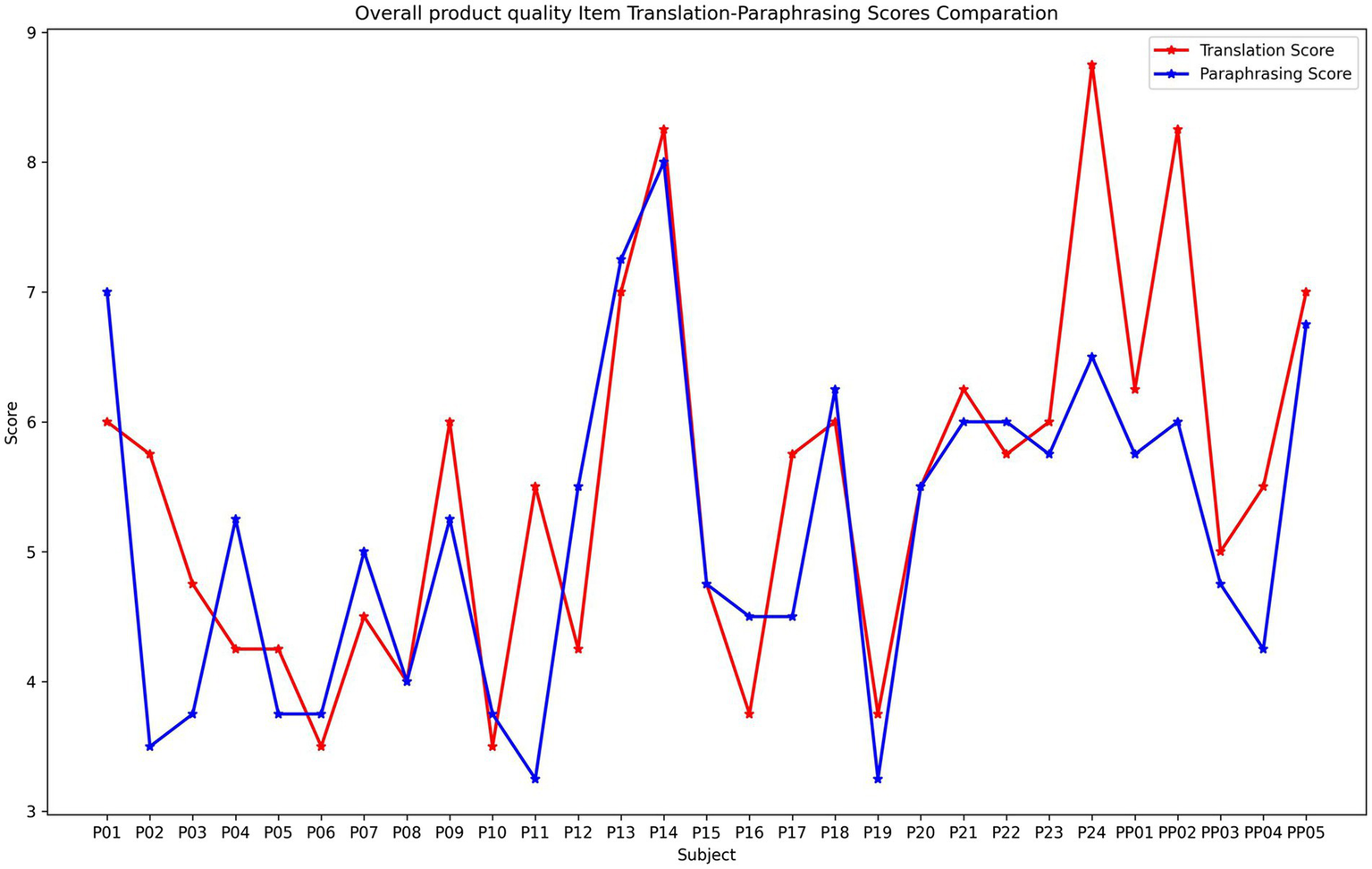 Average rating scores in Overall Product Quality in translation and paraphrasing among 29 participants.