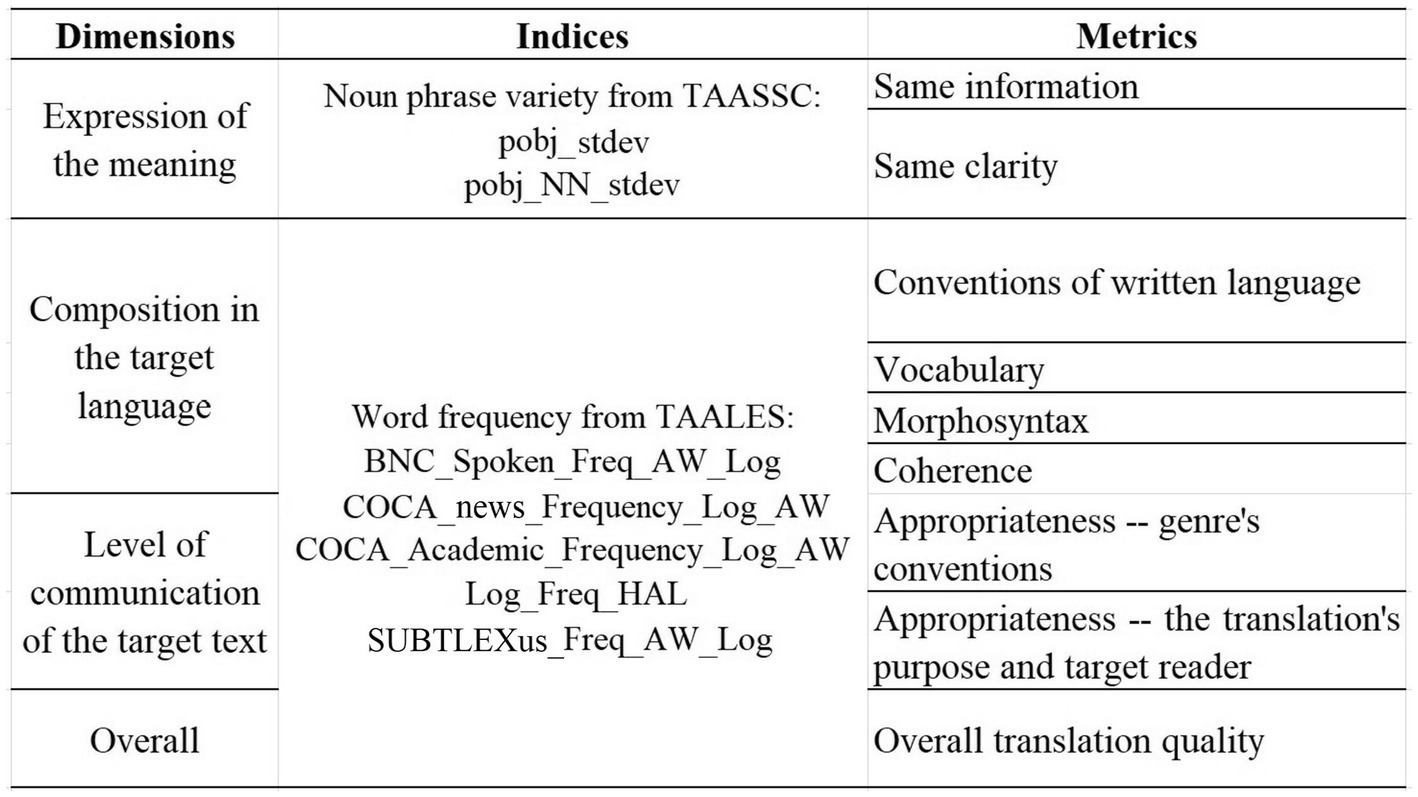 The evaluation of translation quality has long been a heated topic in Translation studies, probably due to its critical role in the educational setting. Over the years, many methods have emerged and been employed by translation teachers to assess translation quality (Han, 2020). Error analysis has been widely adopted in teaching, a comparably systematic approach to quality assessment, thanks to its specified evaluation criteria on error types (Martínez Melis and Hurtado Albir, 2001). Though this approach outstands in its explicit and detailed diagnosis of the weakness in translations (Eyckmans et al., 2016), some argue that it tends to be simplistic by limiting the focus on linguistic accuracy and leaving out the evaluation of extralinguistic dimensions, such as the pragmatic and communicative functions (Colina, 2009; Martínez Mateo et al., 2017; Han, 2020). To compensate, researchers further implement the rubric scoring method, using rating scales to score different levels of translation performance (Waddington, 2001). This idea of combining accuracy analysis with rubric scoring has been proven feasible (Turner et al., 2010; Lai, 2011), and researchers have constructed several versions of translation assessment rubrics including the assessments of language quality and functional adequacy (Colina, 2008; Angelelli, 2009; Hurtado Albir and Taylor, 2015). However, a critical limitation of these frameworks is that they rely primarily on human judgments, which raises two concerns: subjectivity and practicality. The creation of the rating categories and the descriptive statements for the level of each scale could be subjective, and the evaluation of a given text could also differ considerably between evaluators because of multiple influential factors, for example, personal preference and the order of texts (Colina, 2009; De Sutter et al., 2017). Besides, both error analysis and rubric scoring tend to be time-consuming, especially when facing a large number of translation products (Martínez Melis and Hurtado Albir, 2001). These potential problems highlight the necessity to adopt alternative methods which are more objective and time-efficient. Notably, De Sutter made a crucial attempt by turning to a corpus-based and statistical approach (De Sutter et al., 2017). His study aims to find possible linguistic indicators for the evaluation of translation acceptability by comparing language features in student translations, professional translations, and native writings. Although the results of two case studies reported in this paper fail to reach consistency, this research brings insights into a combined approach to TQA by incorporating objective linguistic indicators into translation teachers’ evaluation rubrics.