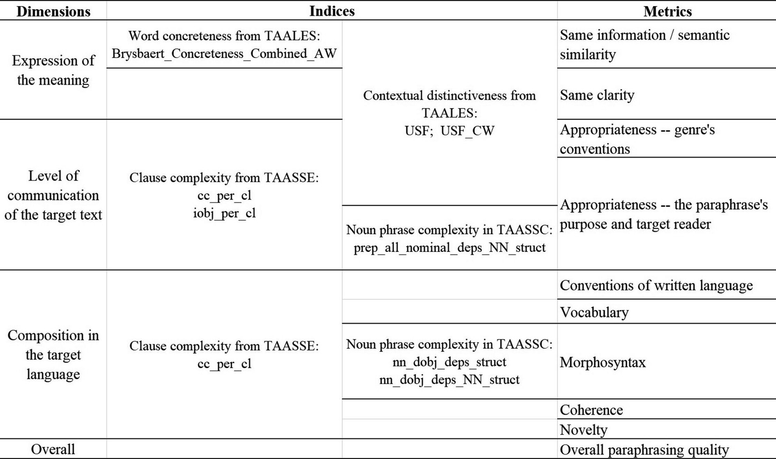 Unlike TQA, there seems to be no consensus on the specific criteria for paraphrasing assessment, and the metrics adopted in previous research are mostly borrowed from relevant research areas, for example, machine translation (Chen et al., 2015; Shalamov et al., 2021; Patil et al., 2022). As a result, a unique feature of PQA is the wide use of automatic evaluation models, which measure the paraphrasing quality with the help of NLP (Patil et al., 2022). Nevertheless, these metrics have been criticized for a rather excessive focus on identifying the similarities between the source text and the paraphrased product, probably affected by the highlighted purpose of paraphrases in academic writing to avoid plagiarism (Nicula et al., 2021; Shalamov et al., 2021). Such an approach is not without problems, as the main functions of a paraphrase also include meaning preservation and achievement of communicative purposes (Shalamov et al., 2021). From this perspective, they failed to assess the paraphrasing performance thoroughly. To address this issue, researchers have also made preliminary attempts to propose evaluation rubrics for human assessment based on the criteria from neighboring fields (McCarthy and McNamara, 2008; McCarthy et al., 2009; Chen et al., 2015). For example, Chen et al. (2015) developed a guideline for the holistic evaluation of paraphrasing quality modified from the writing rubrics in TOEFL, with the belief that paraphrasing is considered an essential ability in this task and thus can also be suitable for its evaluation criteria. New evaluation rubrics drawn on metrics from other fields are expected to further enrich the methods of PQA.
