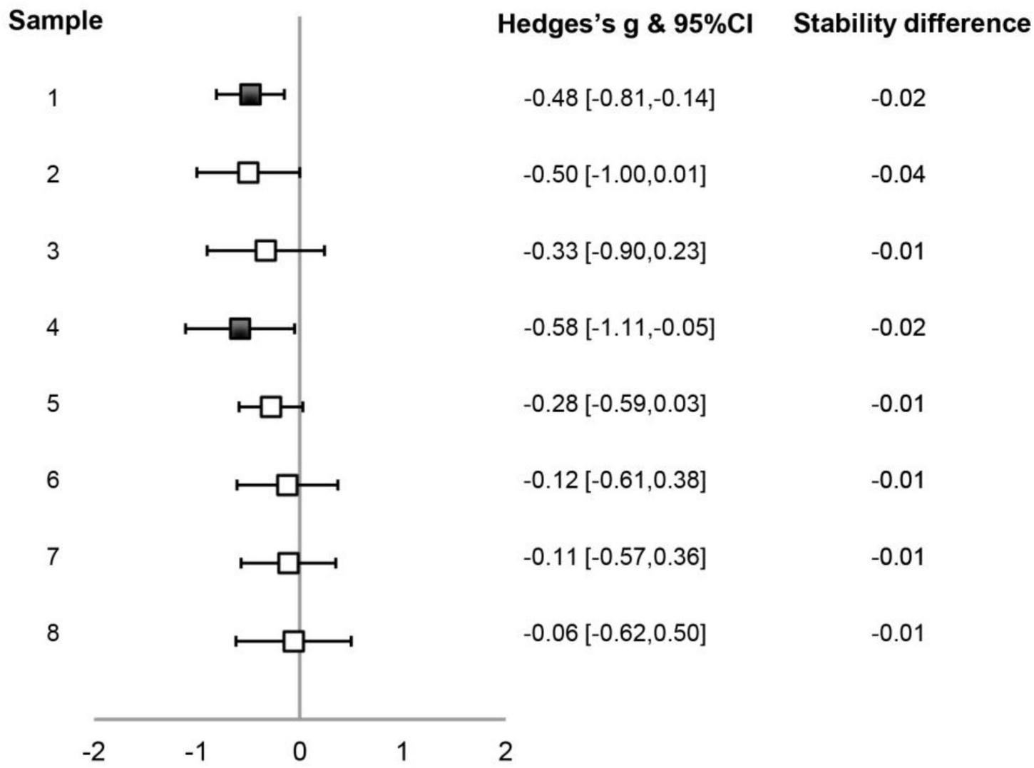 Illustration of the differences between synchronization stabilities of the auditory tone (AT) and the visual bouncing ball (VB) sequences in the small sample-size data set. For each data sample, Hedges’s g of the stability difference between the two sequence types and the 95% CIs are plotted (filled symbols indicating p < 0.05), with the values listed on the right of the plot. The value of the mean stability difference is also indicated. Other conventions are as in Figure 1 and Table 1.