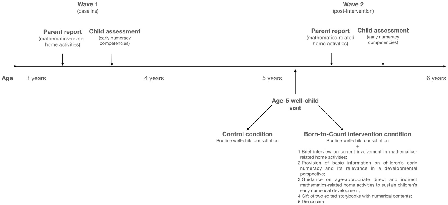 The primary aim of the current work was to investigate whether parents’ involvement in a non-intensive intervention delivered by community pediatricians during scheduled well-child consultations at age 5 was associated with subsequent parents’ engagement in shared mathematics-related activities at home, as well as with children’s early numeracy development. To this end, the Nati per Contare (litt.: Born-to-Count) program was developed in cooperation between the local health authority of the district of XXXX, the Universities of YYYY and ZZZZ (blinded for review purposes), and an Italian professional association of pediatricians (Associazione Culturale Pediatri Romagna – ACPR). Community pediatricians involved in the Born-to-Count program were trained to provide parents with advice on the importance of early numerical competencies, and guidance on home mathematics-related activities that could be easily implemented in daily family routines (e.g., cooking activities, board games, shared reading of storybooks with numerical contents). The primary expected outcome was a steeper increase in the provision of mathematics-related activities, as compared to a baseline assessment conducted during the first preschool year, at age 3, among parents who received the Born-to-Count intervention, relative to those in a business-as-usual control condition who did not receive any numeracy-related advice during well-child consultations. The secondary expected outcome was an improvement in children’s performance on a standardized assessment of early numeracy from baseline to the end of the third preschool year. Feasibility and acceptability of the Born-to-Count intervention were also assessed.