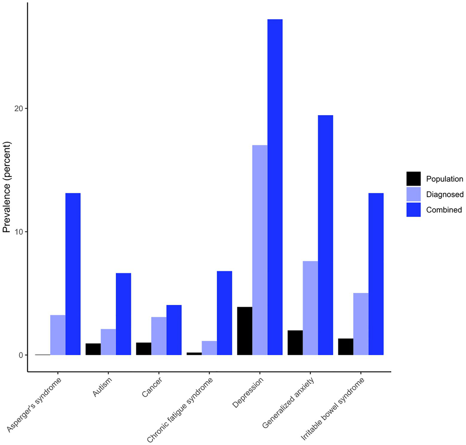 Compared to the general population, our sample exhibited considerably elevated prevalences in autism spectrum disorders (risk ratio/RR = 2.25), chronic fatigue syndrome (RR = 5.69), depression (RR = 4.38), generalized anxiety (RR = 3.82), and irritable bowel syndrome (RR = 3.76). Contrary to previous accounts, neither asthma, allergies, nor autoimmune diseases were elevated. We show that this subsample of intellectually gifted persons faces specific health challenges compared to the general population. The reasons for this remain speculative, as we find little evidence for previously proposed immunological explanations. However, it is possible that the effects are caused by sample selectiveness (i.e., membership in a high-IQ society) rather than high IQ itself.