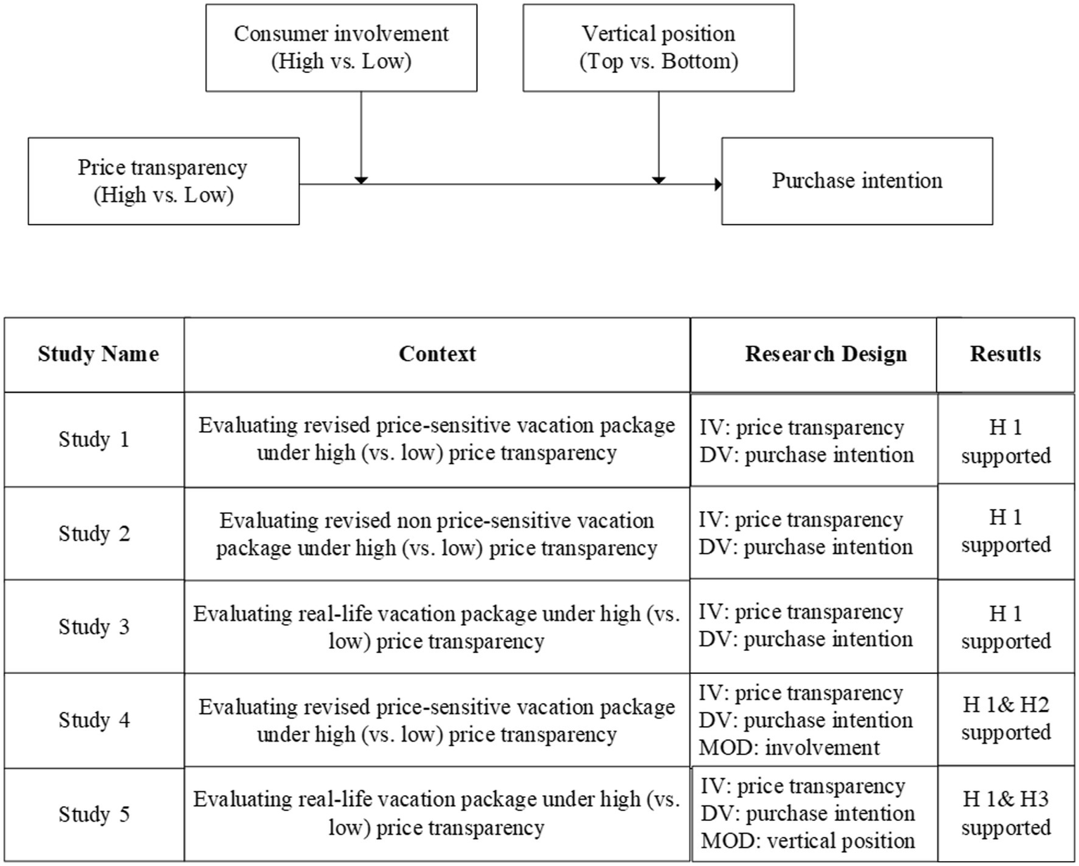 Above all, this paper explores the following questions through five experiments: (1) Under the circumstances of different levels of price transparency, how will consumers purchase travel packages? (2) How does consumer involvement affect the relationship between price transparency and consumer purchase intention, and will it play a moderating role? (3) How does the vertical position of an element price moderate the impact of price transparency on consumers’ purchase intention? Experiments 1, 2 and 3 mainly studied consumers’ willingness to purchase vacation packages under different levels of price transparency by changing experimental materials and participants. The main effects were verified through three experiments to ensure the external validity and robustness of the primary effect of price transparency, which lays the foundation for the subsequent tests of the moderating factors; Experiment 2 mainly examined how consumer involvement affected consumer responses to price transparency; Experiment 3 mainly investigated how the vertical position of an element price moderated the impact of price transparency on consumer decision-making. The conclusion of these experiments will provide some reference for travel agencies to make more effective price marketing strategies.