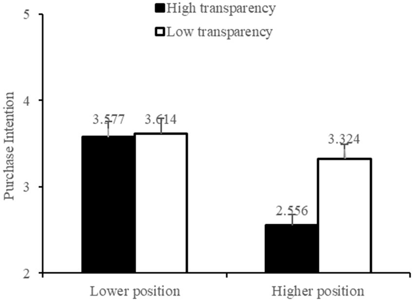 Then, we conducted a main effect test by using one-way ANOVA with price transparency as the independent variable and consumers’ purchase intention dependent variable. The findings indicated that price transparency negatively influenced consumers’ purchase intention. Specifically, low transparency activated higher purchase likeliness (M = 3.737, SD = 0.921) than high transparency (M = 3.473, SD = 0.961, F (1, 296) = 5.847, p = 0.016, η2 = 0.20).