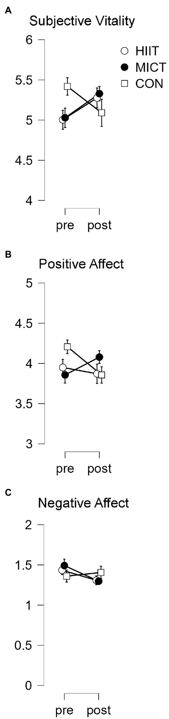 A TIME × TREATMENT interaction effect was found for the positive Affective state, [F(1.57, 53.35) = 4.65, p = 0.02, ηp2 = 0.12], where the tendency to get worse was true for both HIIT and CTRL, but the opposite trend (the tendency to increase) was revealed for MICT. Nonetheless, the Bonferroni post hoc analysis did not find any statistically significant differences. This would suggest that differences observed in the ANOVA RM are concerned with the different trends of the variables and not with the significant changes following interventions (Figure 2B).