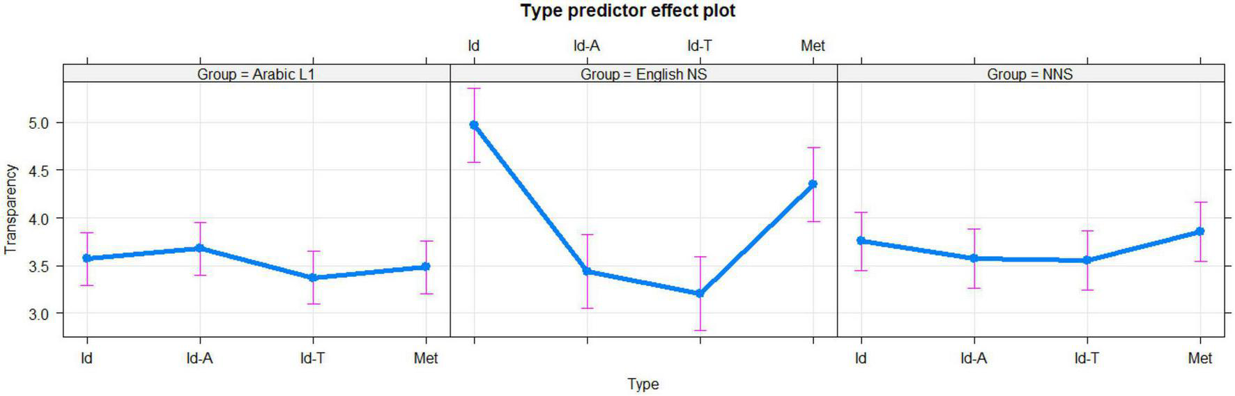Ratings of transparency broken down according to each phrase type (Id, English idioms; Met, novel metaphors; Id-T, generally translated idioms; and Id-A, Arabic idioms) for the Arabic L1 (left panel), English native speakers (NS) (middle panel), and non-native speakers (NNS) (right panel) groups. The 95% confidence interval is represented by error bars.
