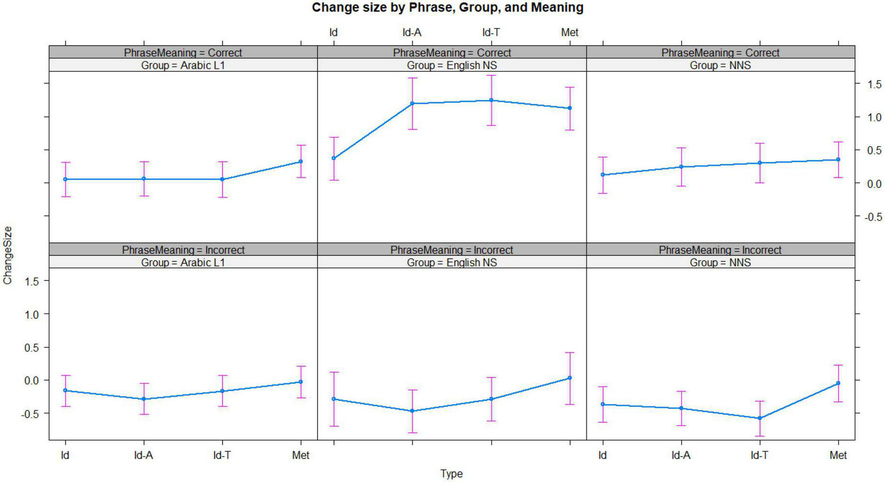 The size of change from initial transparency to subsequent decomposability scores for each phrase type, for items where the meaning was correctly identified (top three panels) and was not (bottom three panels). Id, English idioms; Met, metaphors; Id-T, generally translated idioms; and Id-A, Arabic idioms. Error bars represent 95% confidence intervals.