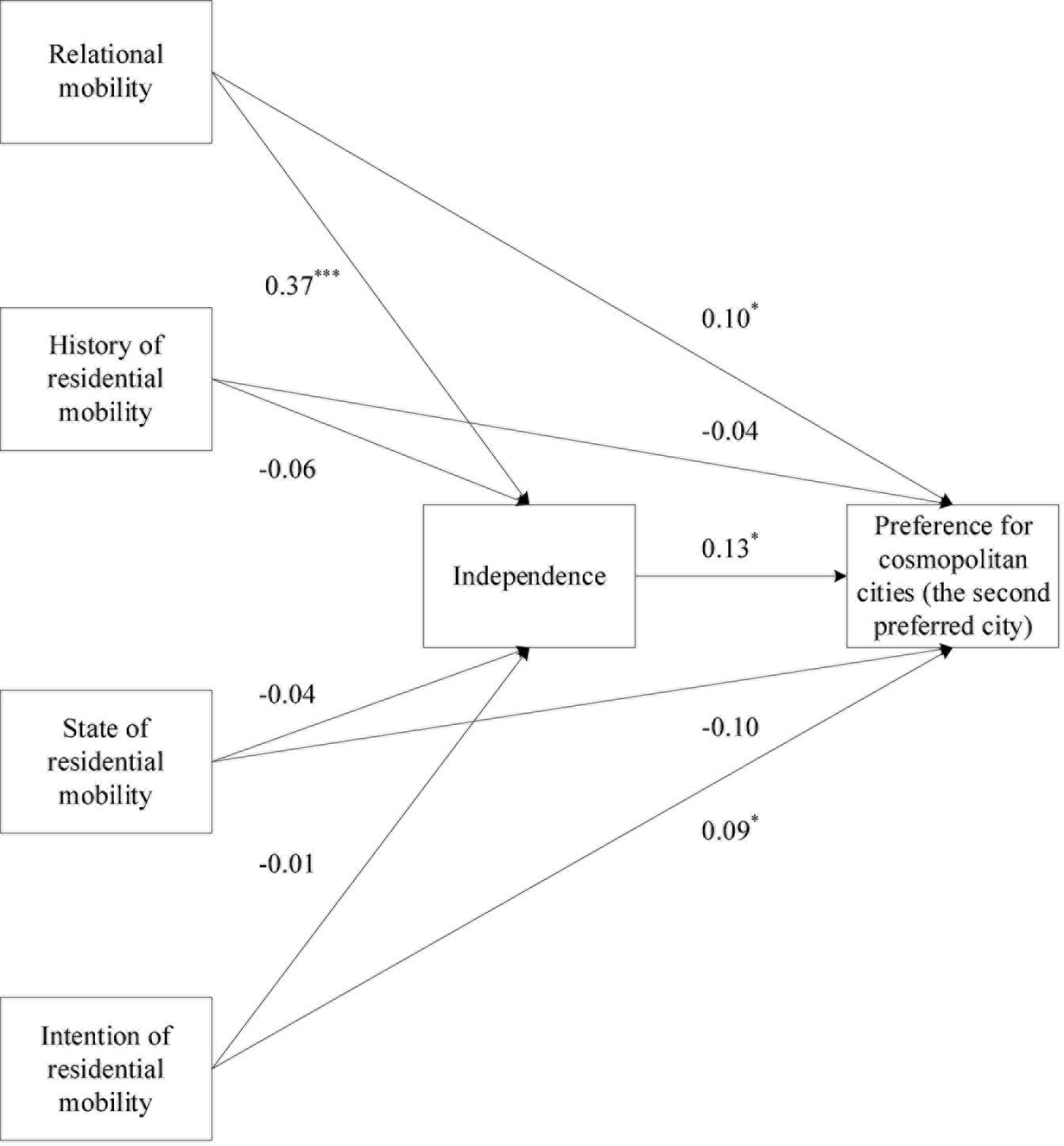 The mediating role of independence in the association between mobility and preference for cosmopolitan cities (the first preferred city), with standardized coefficients. Results of covariates are not shown for the purpose of simplicity; ***p < 0.001, *p < 0.05.