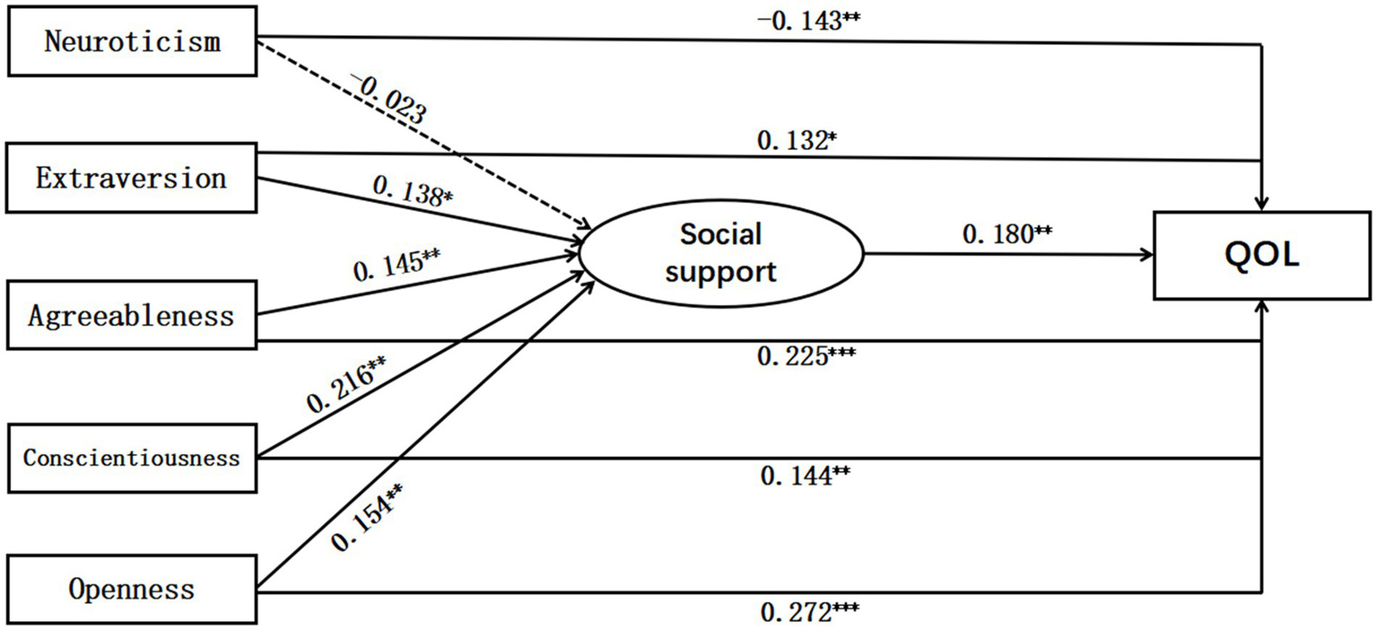 Pearson’s correlation analysis (Table 2) showed that neuroticism was negatively correlated with extraversion (r = −0.185, p < 0.001), agreeableness (r = −0.181, p < 0.001), conscientiousness (r = −0.175, p < 0.001), openness (r = −0.114, p <0.05), social support (r = −0.120, p < 0.05), and QOL (r = −0.186, p < 0.001). QOL was positively correlated with social support (r = 0.402, p <0.001), extraversion (r = 0.324, p < 0.001), agreeableness (r = 0.474, p < 0.001), conscientiousness (r = 0.482, p < 0.001), and openness (r = 0.498, p < 0.001). Social support was positively correlated with extraversion (r = 0.251, p < 0.001), agreeableness (r = 0.307, p < 0.001), conscientiousness (r = 0.370, p < 0.001), and openness (r = 0.304, p < 0.001). Extraversion was positively correlated with agreeableness (r = 0.113, p < 0.05), conscientiousness (r = 0.345, p < 0.001), and openness (r = 0.238, p < 0.001). Agreeableness was positively correlated with conscientiousness (r = 0.508, p < 0.001) and openness (r = 0.361, p < 0.001). And a significant positive relationship was observed between conscientiousness and openness (r = 0.379, p < 0.001).