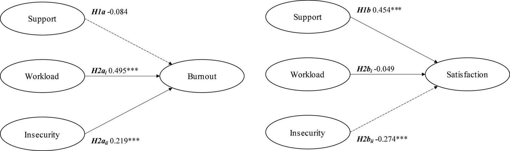 | Workload → burnout | 0.675*** | 1.075 | 0.450*** | 0.264 | 0.496*** | 0.408 | |||