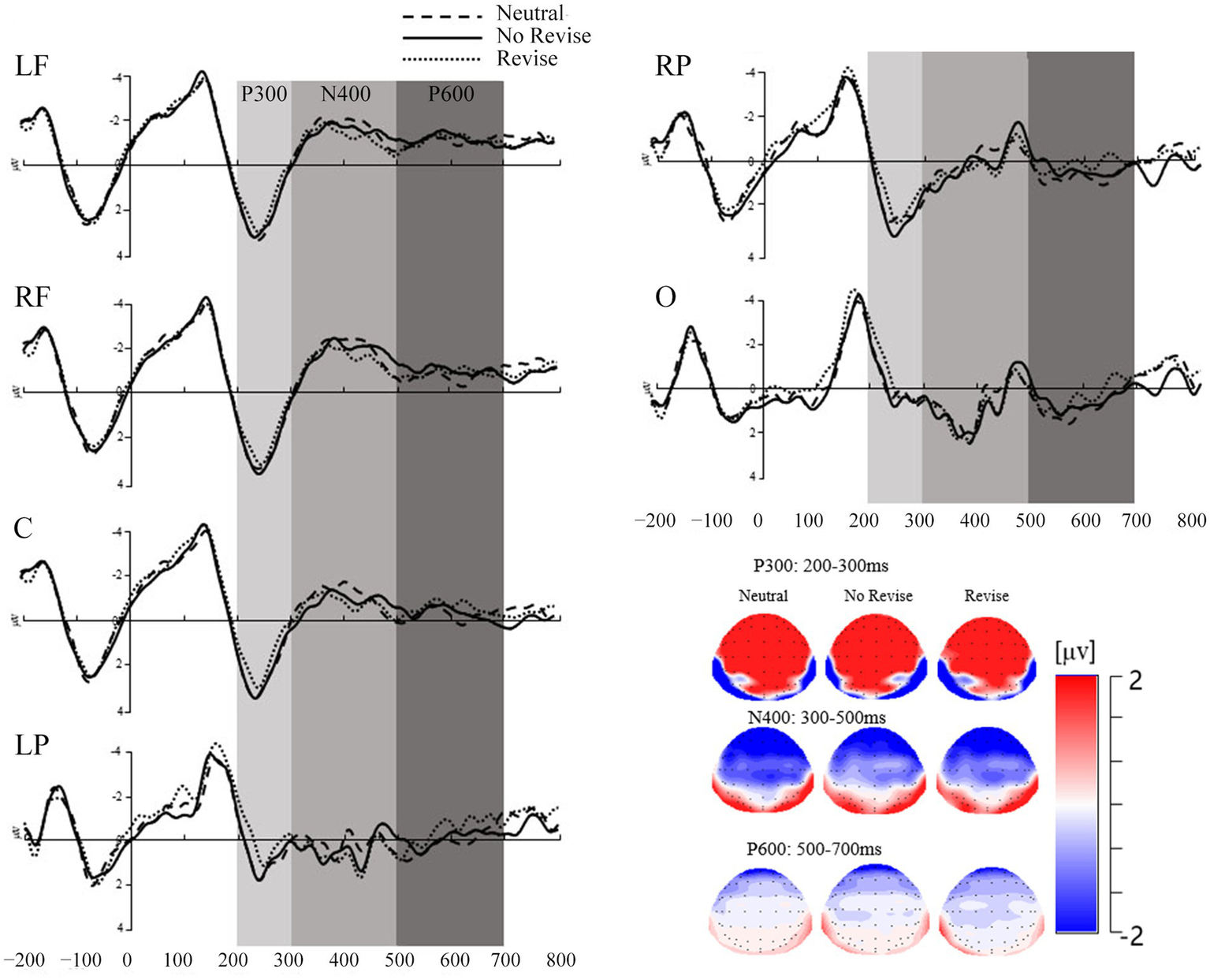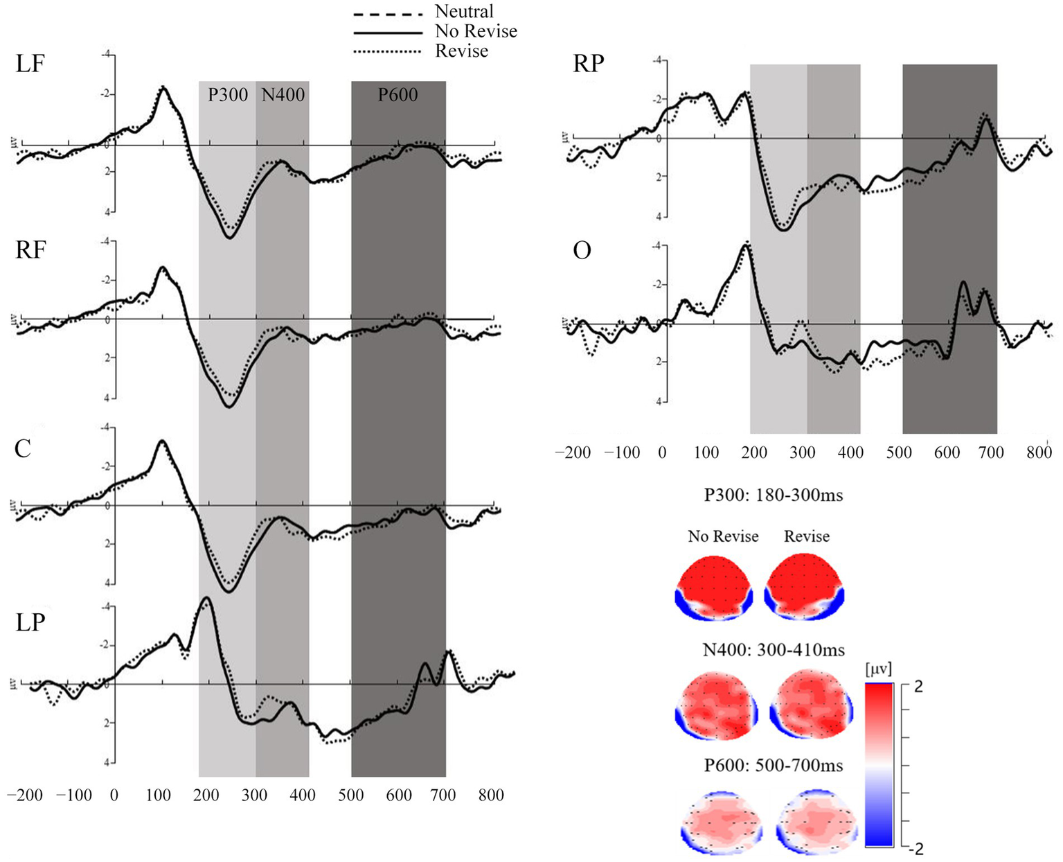 A 3 (contextual conditions: neutral, no revise, and revise) × 6 (ROIs: central frontal: LF, RF, C, and posterior: LP, RP, and O) repeated measures ANOVA was conducted on the mean amplitude data of N400 in the time window of 300–500 ms. There was a significant main effect of contextual conditions, F(2, 44) = 5.91, p = 0.005, η2p = 0.21, with significantly more negativity in the mean amplitude data in the neutral condition (M = −0.78, SD = 1.66) than in the revise condition (M = −0.45, SD = 1.56) than in the no revise condition (M = 0.01, SD = 1.47). There was also a significant main effect of ROIs, F(2, 44) = 30.11, p < 0.001, η2p = 0.58, with the frontal-central areas, including LF (M = −1.11, SD = 1.71), RF (M = −1.37, SD = 2.02), and C (M = −0.69, SD = 1.45), being more negative than the parietal-occipital areas, namely LP (M = 0.24, SD = 0.99), RP (M = 0.01, SD = 1.07), and O (M = 0.48, SD = 1.11). A significant two-way interaction effect between contextual conditions and ROIs was also observed, F(2, 44) = 5.75, p < 0.001, η2p = 0.21. Follow-up simple effects analysis showed a main effect of contextual constraints in the neutral condition, F(5, 110) = 27.65, p < 0.001 and the revise condition, F(5, 110) = 28.87, p < 0.001, showing more negativity in the amplitude data in the neutral and no revise condition than in the revise condition. In addition, the results also showed a main effect of ROIs in LF, F(2, 44) = 8.78, p = 0.001, RF, F(2, 44) = 7.51, p = 0.002, and C, F(2, 44) = 6.17, p = 0.004, indicating more negativity in these three ROIs than in the posterior and occipital regions.