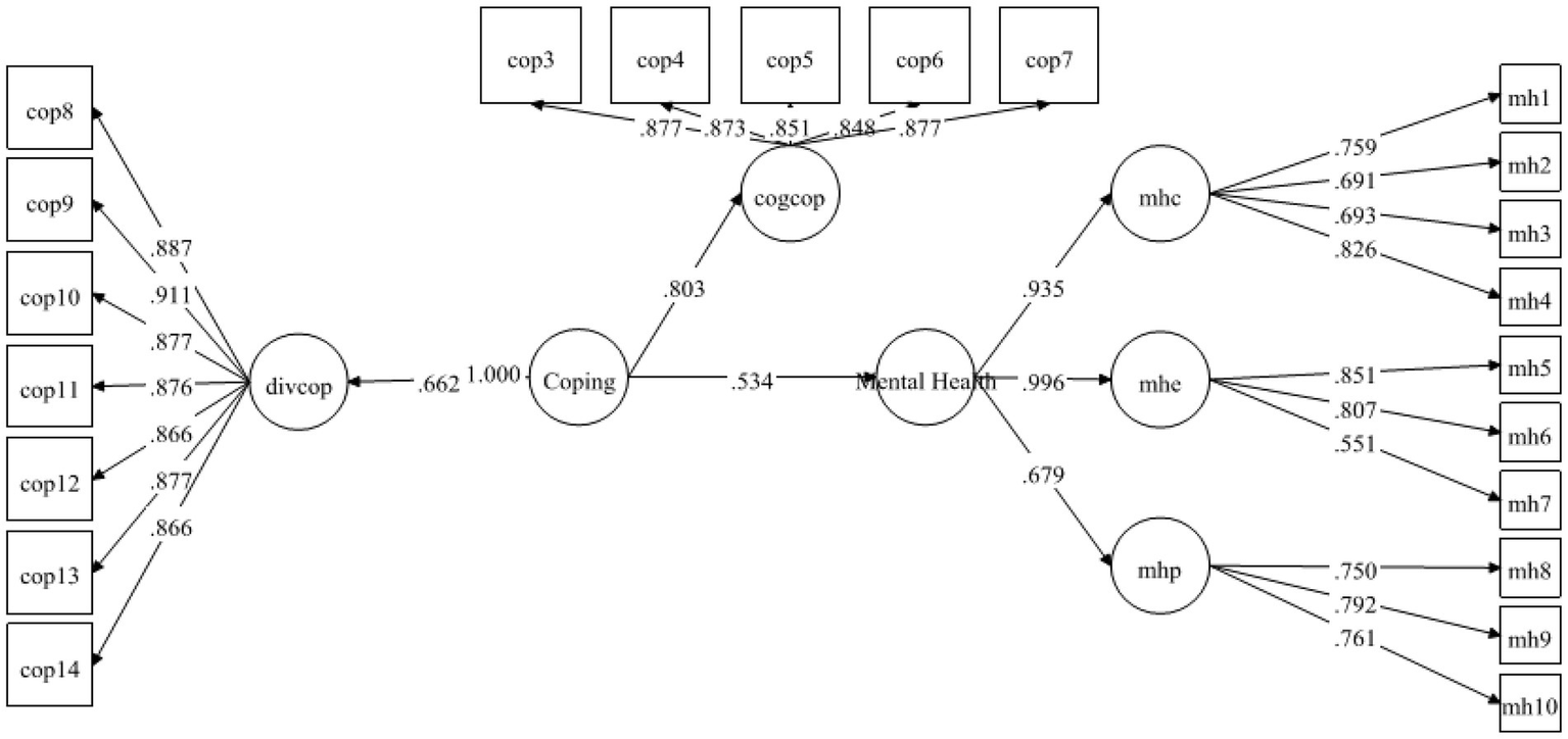The mean scores of the variables ranged from 5.01 of FS to 6.38 of PSS whereas the standard deviation ranged from 0.587 of COP to 1.023 of FS. The values of standard deviation remained well within prescribed range and the data was found to be good to enough to be handled using Mplus (Van Der Linden et al., 2017). To compliment this, we also calculated Skewness/Kurtosis to make assessment about the normality of the data. It was found that the values of both the statistical measures were well within acceptable range. Table 4 placed above provides variable specific details about normality and data variability.