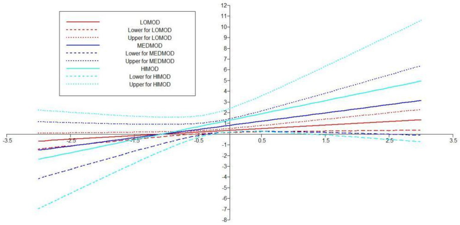 Fore investigating the moderating role of PSS, the study first examined its role on the relationship of FS and MH. Therefore, in order to proceed with the analysis, researcher applied “Xwith” technique for creating the interaction term between concerned IV-MV (Van Der Linden et al., 2017) and for assessing the effect of interaction term (see Figures 6, 7). These results exposed that H5 was not supported as the Table 8 indicated that the interaction effect of PSSXFS (moderating variable * IV) was β = 0.147 (p = 0.228) with a 95% CI [−0.054 to 349].