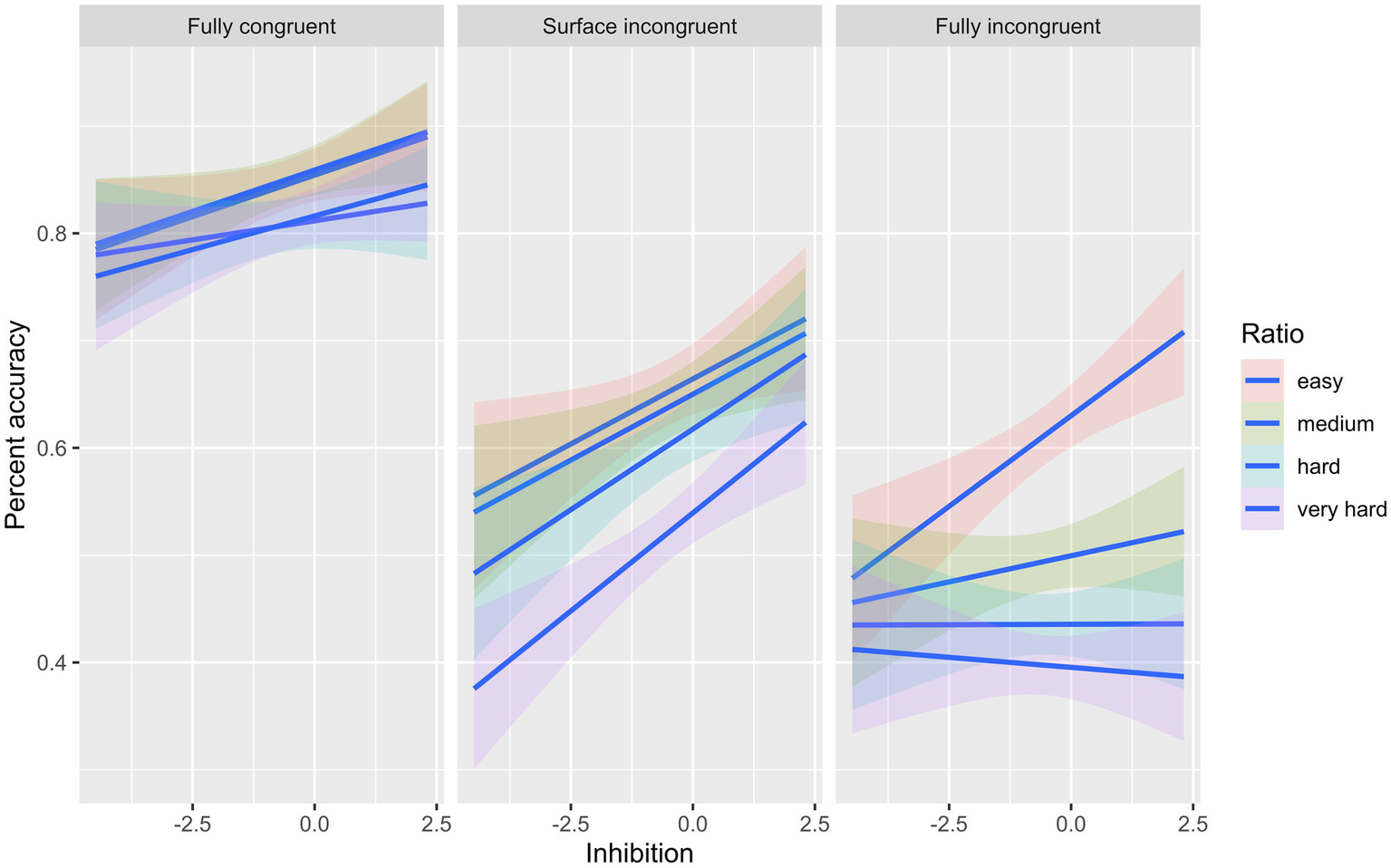 In model 1, all level-1 and level-2 predictors made significant contributions to accuracy; however, in model 2, all the main effects were involved in double and triple interactions (see Table 3). The first double interaction between ratio and the type of trial (Ratio: Fully incongruent) revealed that the relationship between ratio and dot comparison accuracy depends on trial type. The coefficient was negative, indicating a diminishing effect, which implies that as the ratio increased (became harder to solve), dot comparison accuracy decreased, with this relationship being significantly stronger for fully incongruent trials than for other trial types. The second double interaction between inhibitory control and type of trial (Fully incongruent: Inhibition) showed that the relationship between inhibition and dot comparison accuracy depends on trial type. The coefficient was positive, indicating an enhancing effect, which means that as accuracy in the inhibition tasks increased, so did dot comparison accuracy, and the relationship became stronger for fully incongruent trials. Next, we examined the triple interaction between ratio, type of trial, and inhibitory control (Ratio: Fully incongruent: Inhibition). The relationship between dot comparison accuracy and inhibitory control decreased as the ratio increased for fully incongruent trials. There was no change as a function of ratio in the relationship between accuracy and inhibitory control tasks in fully congruent and surface area incongruent trials (see Figure 1).