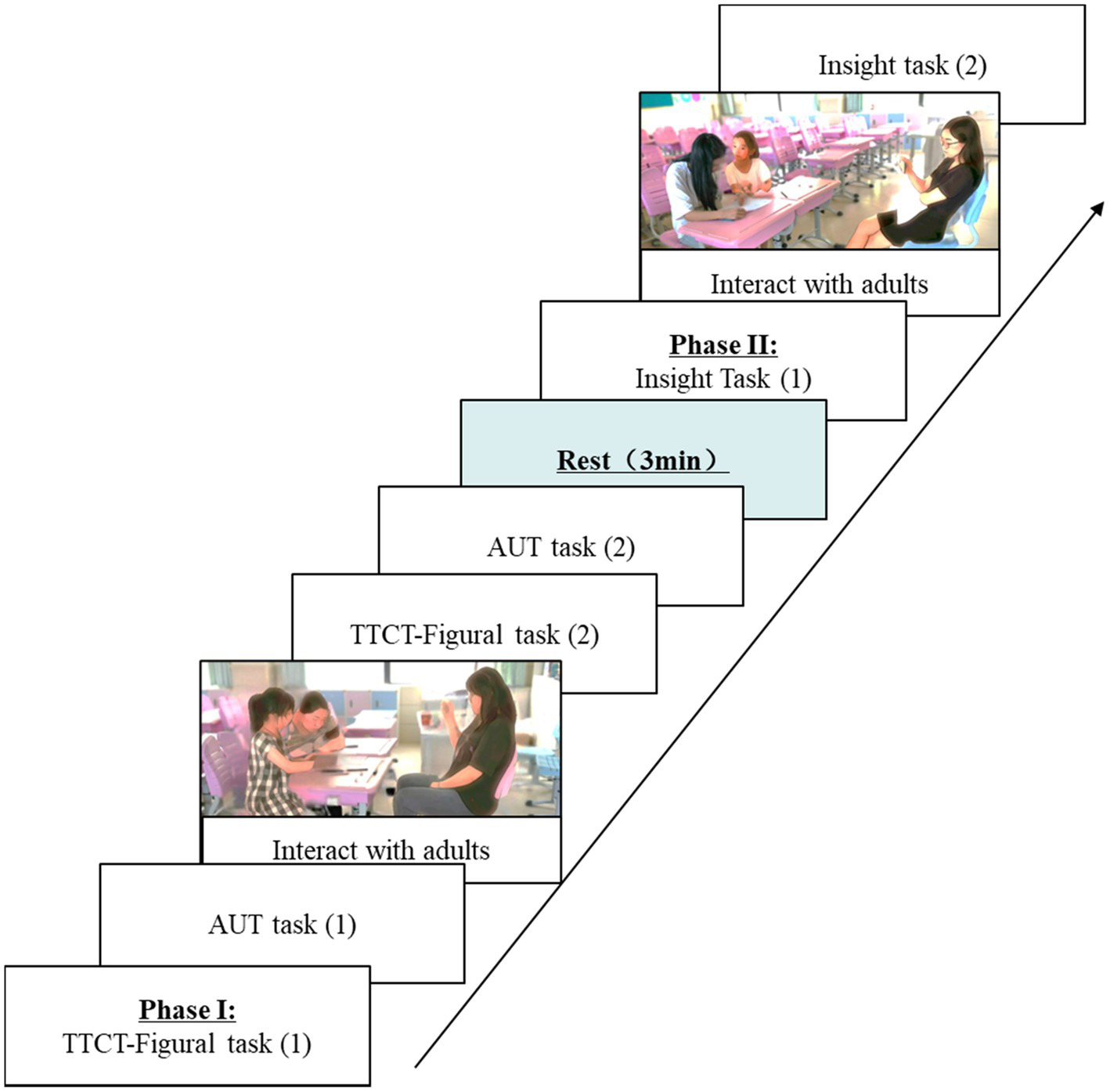 In each complete experiment, once with a parent and once with a grandparent, children were asked to complete (1) a set of TTCT-Figural tasks and AUT tasks in Form AB or Form CD, each with a time limit of 3 min; (2) grandparent–child interaction or parent–child interaction, each with a time limit of 3 min, for a total of 3 tasks; (3) another set of TTCT-graphic tasks in Form AB or Form CD of the same difficulty TTCT-Figural task and AUT task with a time limit of 3 min each for a total of 3 tasks; (4) a set of insight problem solving in form AB or form CD with a time limit of 3 min each for a total of 4 tasks; (5) grandparent–child interaction or parent–child interaction with a time limit of 5 min; and (6) another set of insight problem solving in form AB or form CD with the same difficulty with a time limit of 3 min each for a total of 4 tasks.