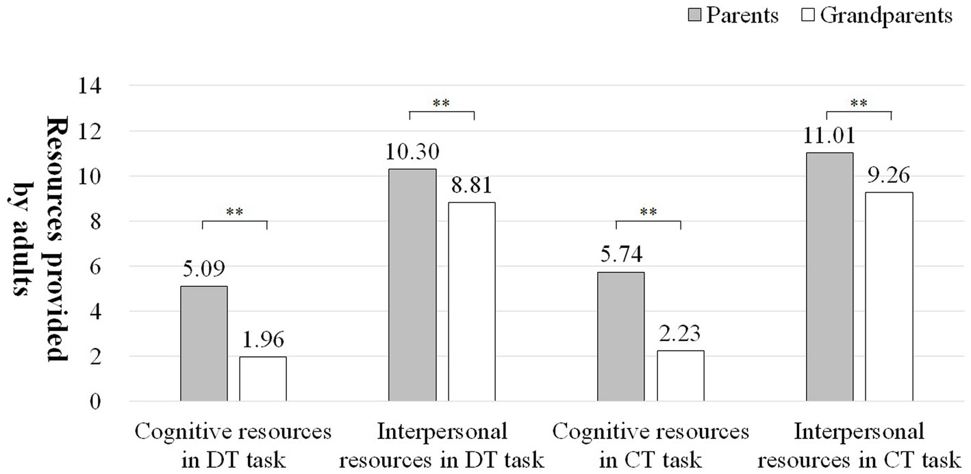 According to parental investment theory, prompting instruction and exemplary instruction provided by adults in the interaction, as well as adults’ problem-solving skills, are cognitive resources. The sum of positive feedback, body distance, intimacy, and adult’s emotional state minus negative feedback are interpersonal resources. During the interaction, parents gave more resources to their children compared to grandparents, both in terms of cognitive and interpersonal resources (tcognitive resources in DT task = 6.180**, tinterpersonal resources in DT task = 5.024**, tcognitive resources in CT task = 5.703**, tinterpersonal resources in CT task = 4.517**, see Figure 2). Thus, as described in Hypothesis 1, parents can provide more cognitive and interpersonal resources than grandparents in their interactions with their children.