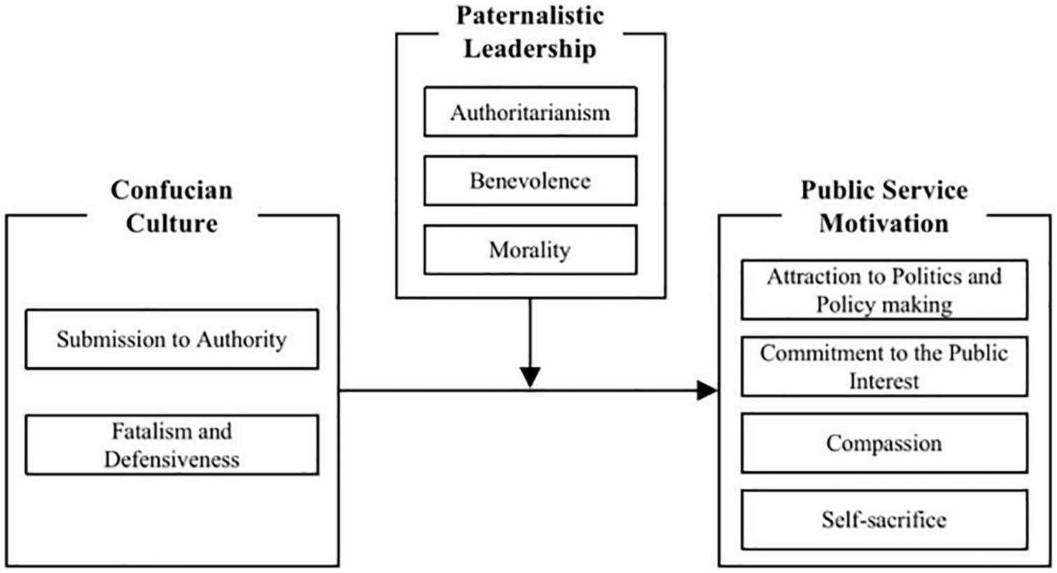The traditional Confucian culture not only shaped people’s values, but also gave birth to paternalistic leadership integrating authoritarianism, benevolence and morality (Farh and Cheng, 2000). Paternalistic leadership is based on the Confucian “family and the world” culture. It is defined as a “leadership style of strict discipline and authority, fatherly benevolence and moral integrity,” including three dimensions of authoritarianism, benevolence, and morality (Farh and Cheng, 2000), which is an important feature of the current Chinese organizations (Cheng et al., 2004). Members who comply with authoritarianism are ready to maintain this hierarchical relationship and make more efforts to safeguard the interests of leaders and the collective (Cheng et al., 2004; Shen et al., 2019). Patriarchal leadership shows the interactive relationship between Chinese leaders and subordinates, and subordinates react differently in line with different leadership styles (Cheng et al., 2004). It can be inferred that paternalistic leadership plays a moderating role in the influence of Confucian culture on public service motivation.