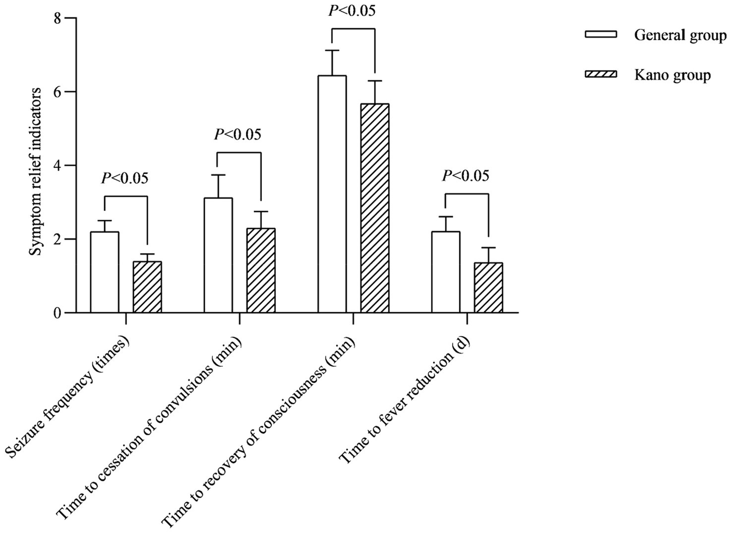 In terms of symptom relief, the children in the Kano group had less frequent of FS seizure than the general group, and the time to cessation of convulsions, time to recovery of consciousness and time to fever reduction were all earlier than in the genera group (p < 0.05). In terms of children’s psychological behavior, the impulsivity-hyperactivity, anxiety, hyperactivity index and learning problems scores in the PSQ of the children in the Kano group were lower than those in the general group after the intervention (p < 0.05). In terms of family psychological behavior, the psychological behavioral problems of the families of the children in both groups improved after the intervention, and the CPSS scores of tension and dis-control, as well as the total SCL-90 score of the families of the children in the Kano group were lower than those of the general group (p < 0.05). In terms of family satisfaction, the Kano group was significantly better than the general group (p < 0.05).