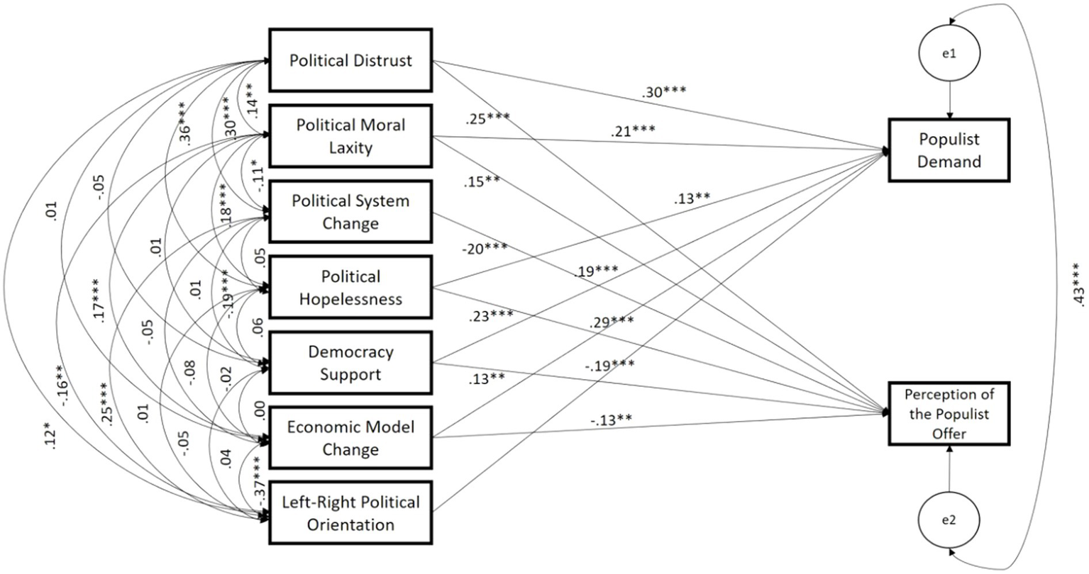 The main results of these correlations are summarized as follows: (1) the Political System Change dimension is significantly and inversely related to Democracy Support and directly related to Satisfaction with Democracy. In addition, Political Hopelessness is negatively associated with Satisfaction with Democracy; (2) The dimensions of Political Distrust, Political Hopelessness, and Political Moral Laxity are positively associated with both dimensions of populist attitudes (Populist Demand and Perception of the Populist Offer), while the dimension of Political System Change is, in both cases, inversely associated. Finally, (3), it can be seen that Populist Demand and Offer Perception correlate directly with Democracy Support. Likewise, Perception of the Populist Offer is inversely related to Satisfaction with Democracy.
