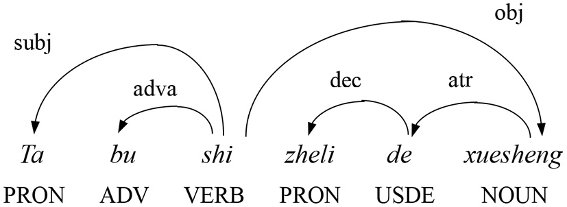 Dependency structure of the sample Chinese sentence Ta bu shi zheli de xuesheng (“He's not a student here.”).