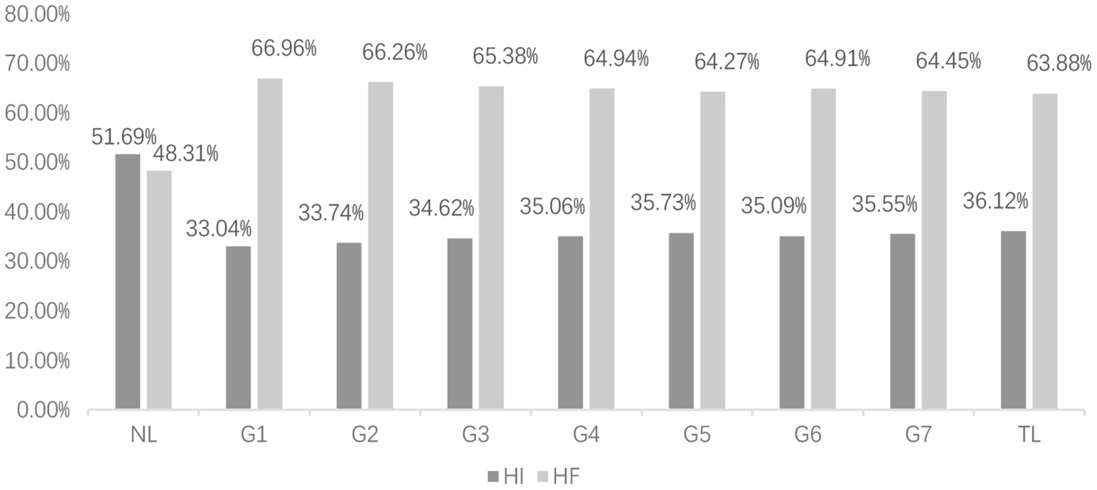Using the above formula, it is possible to calculate the percentage distribution of HF and HI in the overall or the important linguistic structures of Chinese learners from native English backgrounds in different modalities, and thus to study the development of their typological characteristics.
