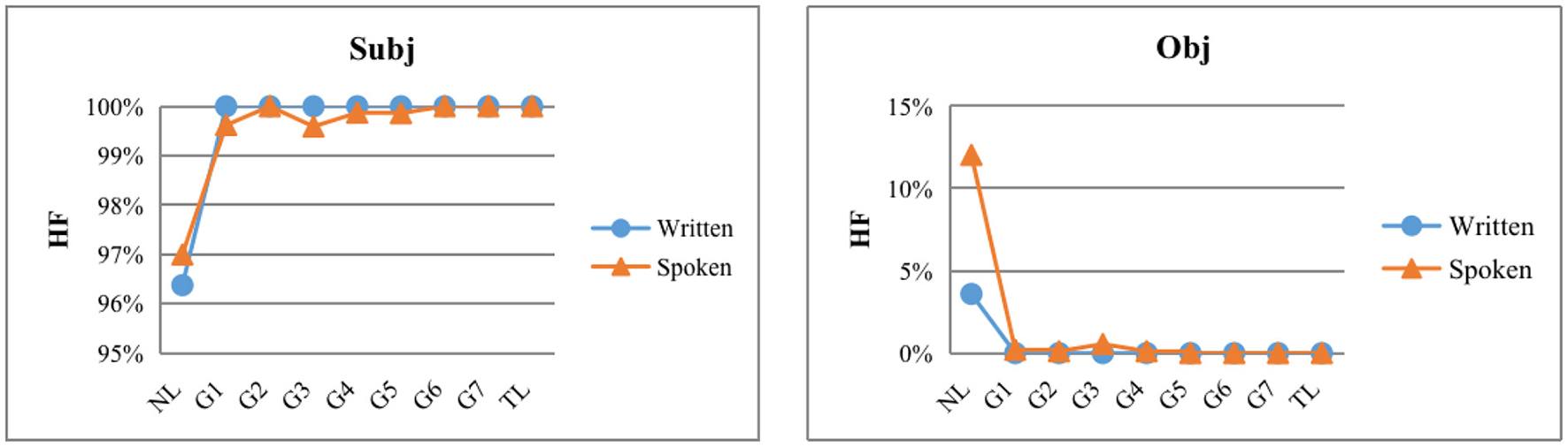 As shown in Figure 4, the HF% of subject language for ECSL learners of all levels of language proficiency in the written modality was 100%, and the HF% of object language was 0%, which was consistent with the native Chinese speakers. In the spoken modality, although the subject dependency direction of the elementary level Chinese learners differed from that of the native Chinese speakers, they all showed the same HF tendency as the TL, with HF% exceeding 99% and approaching 100% (HF% of the subject in the TL); the object dependency direction of the elementary level Chinese learners also differed from that of the native Chinese speakers, but they all showed the same HI. The object dependency direction also differed from that of Chinese native speakers, but they all show the same HI tendency as TL, with HI% exceeding 99% and approaching 100% (object: HI% in TL).