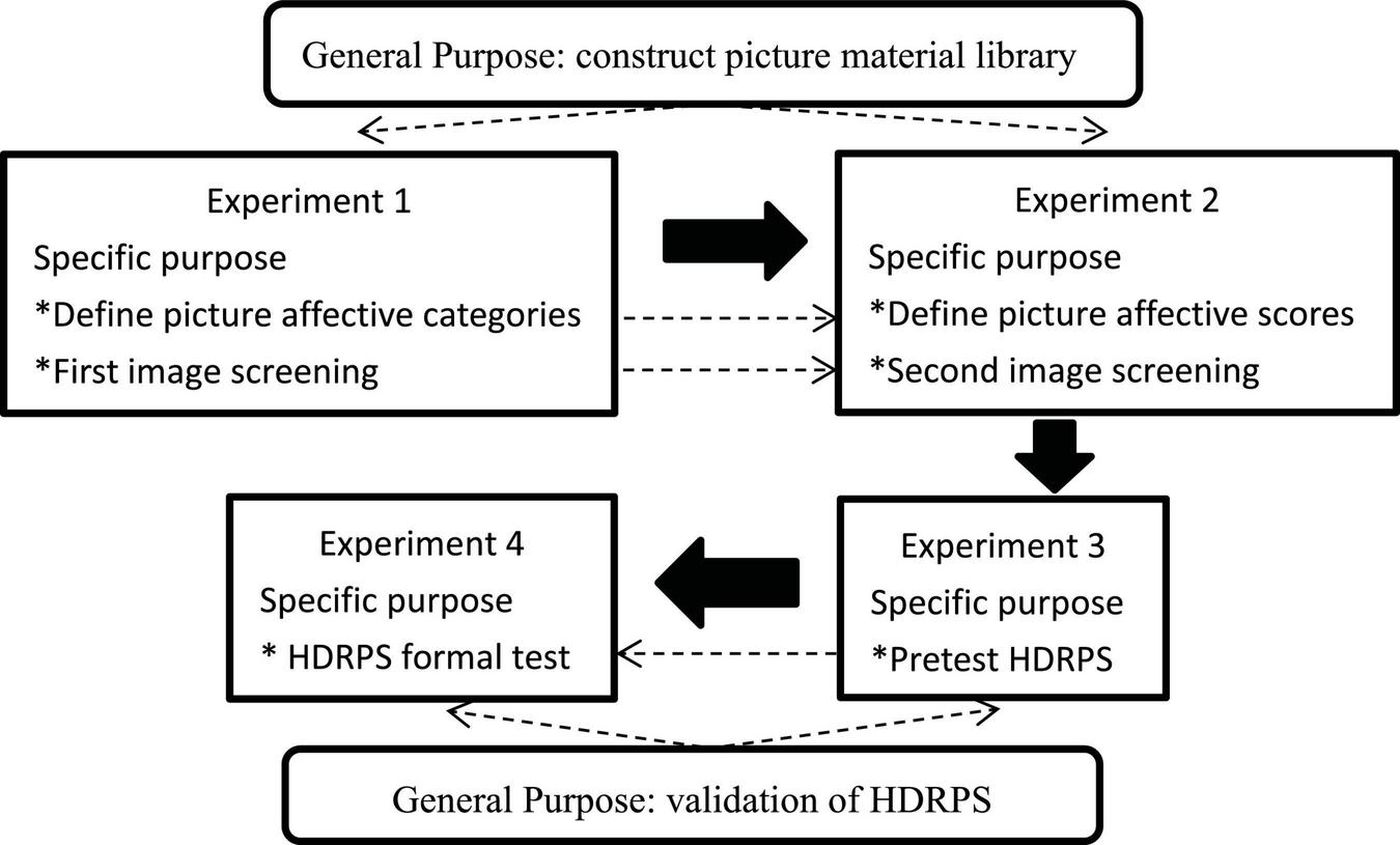 In this research, four experiments were conducted in order to construct a highly dynamic picture-based scale (the details can be seen in Figure 2), of which Experiments 1 and 2 were aimed at constructing a picture material library. Based on dimension theories of emotion, we classified emotions into two dimensions: valence and arousal. Referring to Mehrabian’s (1996) related study for conceptual definition, valence refers to negative vs. positive affective states, which generally vary from cruelty, humiliation, disinterest, and boredom to excitement, relaxation, love, and tranquility. Arousal refers to the level of mental alertness and physical activity, and generally changes from sleep, inactivity, boredom, and relaxation to high arousal states such as wakefulness, bodily tension, strenuous exercise, and concentration. Experiments 3 and 4 were designed to validate picture-based scales applied to reality contexts. Considering that organizational science frequently conceptualizes emotion in terms of positive affective and negative affective (Weiss and Cropanzano, 1996), referring to the related study by Watson et al. (1988), we developed picture-based scales with valence rating as a cue. Then, to verify the validity of the picture-based scale, the semantic scale PANAS and the picture scale SAM were selected as the calibration scales. Further, to ensure the successful conduct of the study, we developed our own Picture Evaluation System (hereinafter referred to as PES)1 and Picture Based Scale Validity Verification System (hereinafter referred to as PSVS)2 to assist in completing the experiments.