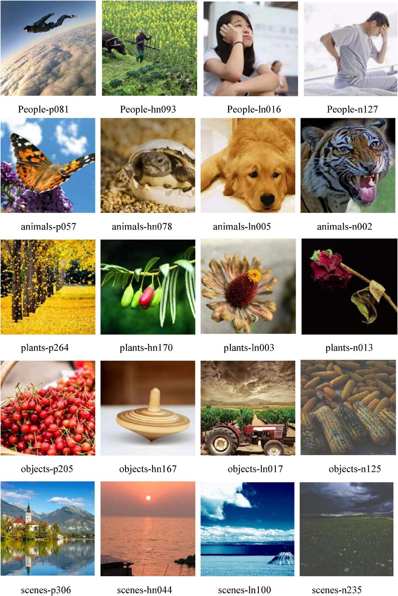 To facilitate image retrieval, we referred to a related study by Marchewka et al. (2014) for artificial image classification with the following criteria. Pictures in the “people” category were described as those containing visible, living human bodies or isolated parts of the human body. Pictures in the “animals” category were described as containing visible animals (images in this category could contain human body parts in the background). The “plants” category was described as plants in the growth cycle without humans or animals present. The “objects” category was described as natural or artificial objects with no human or animal present, in a non-growth cycle. Finally, the “scenes” category was described as images depicting a wide range of natural and man-made scenery, panoramas, or terrain without humans or animals visible.