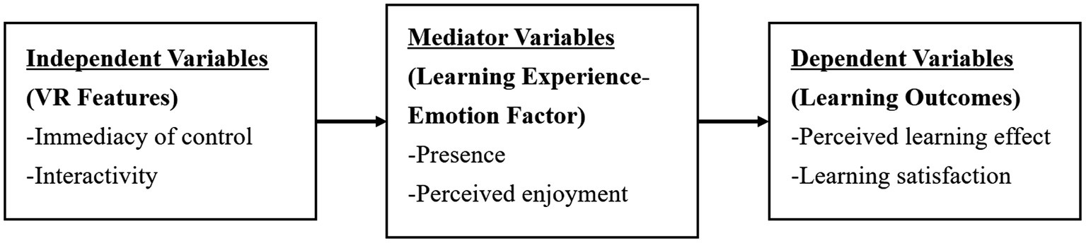 The learning outcome variables used in this study include learning satisfaction and perceived learning effect, while learning satisfaction refers to the degree to which students find the learning experience satisfactory (Makransky and Lilleholt, 2018). The perceived learning effect represents the degree to which the student perceives the learning experience as educational. These two outcome variables were included in the framework because this study explores the impact of technical characteristics and learning experience on learning outcomes in an IVR-based learning environment from the perspective of psychological emotional value. According to Sharda et al. (2004), the classification of learning outcomes can be divided into psychomotor outcomes, cognitive outcomes, and affective outcomes. Psychomotor outcomes include efficiency, accuracy, and response range. Cognitive outcomes include comprehension, knowledge, application, and analysis. Affective outcomes include learners’ perceptions of satisfaction with, attitudes regarding, and appreciation for the learning experience (Sharda et al., 2004; Lee et al., 2010). Therefore, the learning outcomes referenced by this study focus on the affective domain in terms of learning satisfaction and perceived learning effect with the IVR-based learning environment. In addition, previous studies identified these two factors as particularly relevant when using VR technology in an educational context (Lee et al., 2010).
