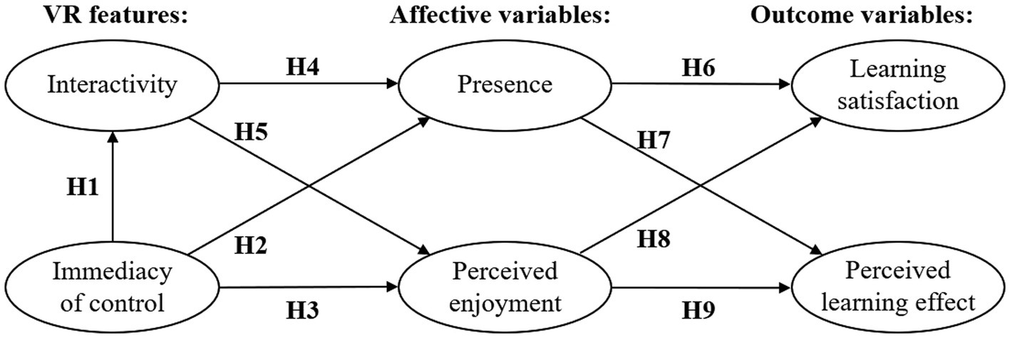 The model constructs used in this study are also supported by the control value theory of achievement emotions (CVTAE, Pekrun, 2000; Makransky and Lilleholt, 2018). The CVTAE is a theoretical framework that describes the causal emotional process associated with the learning process in detail (Pekrun, 2000). The CVTAE believes that enjoyment, as a positive activity emotion, can promote learning (Pekrun, 2006; Pekrun and Stephens, 2010), which is an important emotional factor in the learning process. The research framework established by Makransky and Lilleholt (2018) is based on the CVTAE and the model developed by Lee et al. (2010). Makransky and Lilleholt distinguish between the affective variables and cognitive variables of the CVTAE, thus identifying two general paths that can describe the relationship between the individual’s degree of immersion and perceived learning outcomes in VR scientific simulation. This approach leads to a better understanding of the ways in which technical characteristics and students’ interactive experience affect important emotional and cognitive factors and the manner in which these relationships predict important educational outcomes.