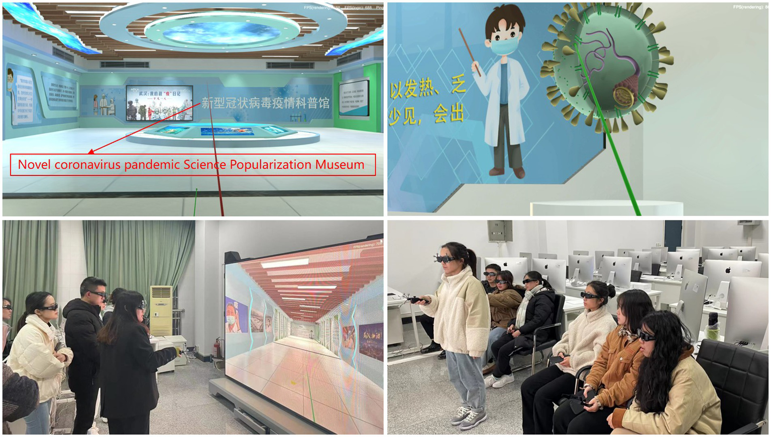 The simulation experience begins with the display of a 2D documentary regarding the pandemic at the Science Center. Subsequently, learners advance interactively through the simulation and visit a circular science popularization corridor. Relevant pandemic prevention and control knowledge and 3D objects are displayed in the air and on the walls on both sides of the corridor. Finally, learners choose whether to initiate the answer mode, according to which a simple test including 10 questions measures users’ mastery of basic knowledge regarding COVID-19 prevention and control. Throughout the whole process of the simulation experience, self-pacing and guided learning principles are adopted to enhance perceived learning outcomes.