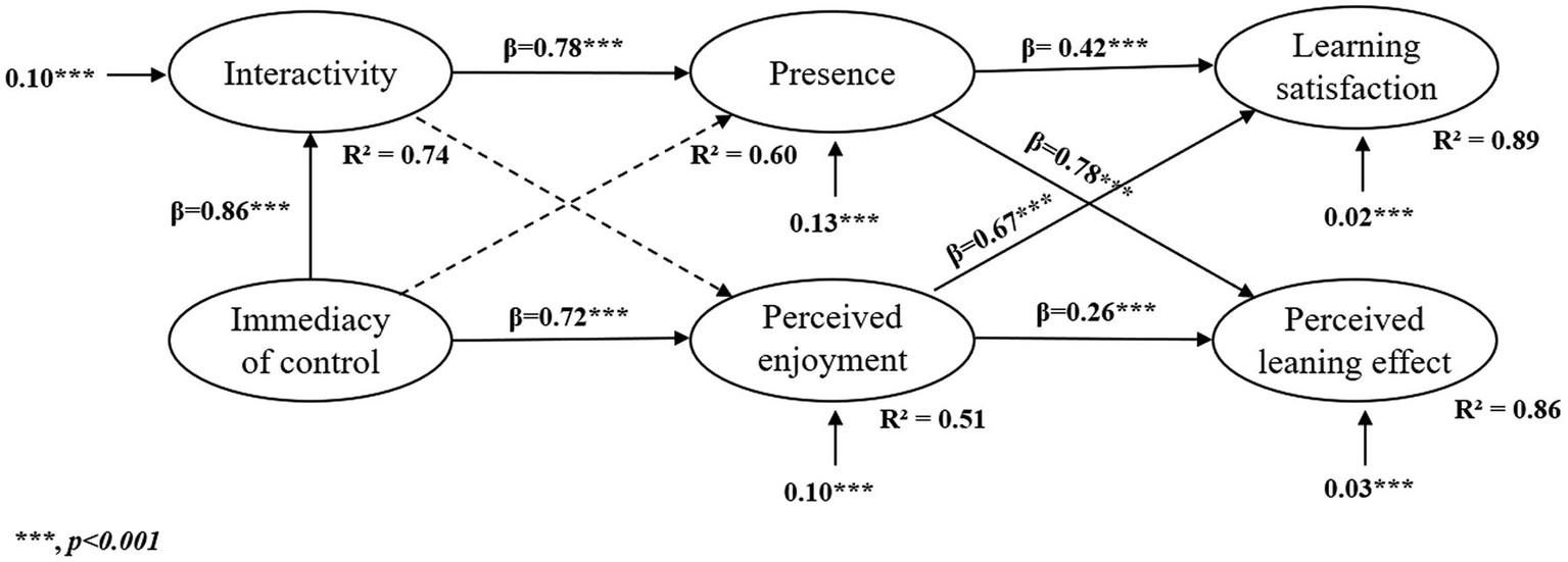 The average variance extracted (AVE) is higher than 0.5, but we can accept 0.4. Because Fornell and Larcker said that if AVE is less than 0.5 but composite reliability is higher than 0.6, the convergent validity of the construct is still adequate (Fornell and Larcker, 1981; Lam, 2012). All six factors involved in this study have AVE values greater than 0.4 and CR values greater than 0.7, which shows that the scale data measured this time has excellent aggregation. In addition, the results showed that perceived learning effect was positively linked with VR features (r = 0.60, p < 0.01; r = 0.64, p < 0.01) and the learning experience emotion factor (r = 0.72, p < 0.01; r = 0.51, p < 0.01). Learning satisfaction was positively linked with VR features (r = 0.62, p < 0.01; r = 0.56, p < 0.01) and the learning experience emotion factor (r = 0.65, p < 0.01; r = 0.67, p < 0.01). Perceived enjoyment was positively linked with VR features (r = 0.55, p < 0.01; r = 0.43, p < 0.01) and presence (r = 0.51, p < 0.01). Presence was positively linked with VR features (r = 0.60, p < 0.01; r = 0.60, p < 0.01). Immediacy of control was positively linked with interactive feedback (r = 0.69, p < 0.01).