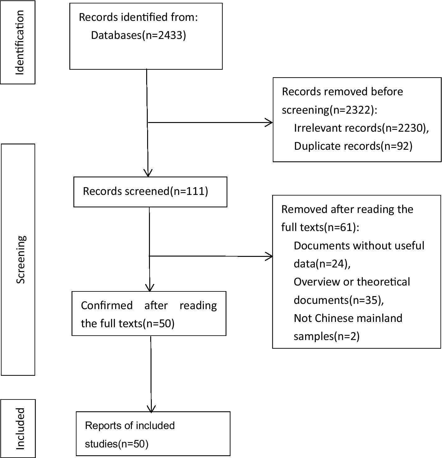 The literature was screened according to the following criteria: (1) The AB scale and the PMPU scale were used simultaneously, and the Pearson product–moment correlation coefficient or the t-value and f-value that could be converted into r were reported; (2) The sample size is reported; (3) The subjects were students in mainland China, excluding other groups such as patients and criminals; (4) If data were repeatedly published, we only adopted professional academic journals. After excluding papers with no data, repeated publication, and no clear sample size, a total of 50 articles met the meta-analysis criteria. Figure 2 depicts the PRISMA flow chart of the systematic search.