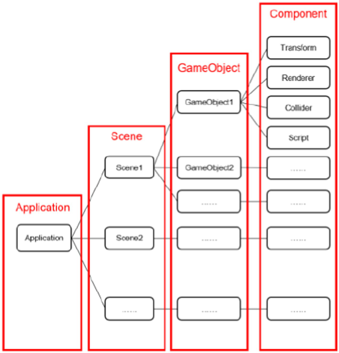 As is shown in Figure 1, the Unity 3D development process can be mainly divided into four parts: Application, Scene, GameObject, and Component.