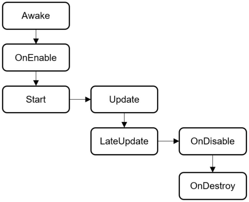 Event functions are common methods in the MonoBehavior class. When creating a new empty script in Unity 3D, the script will have two event functions, Start() and Update(), by default. In addition, event functions include Awake(), OnEnable(), LateUpdate(), OnDisable(), and OnDestroy(), which reflect the life cycle of the script running process in terms of time and logic. The general running sequence of these event functions is shown in Figure 2.