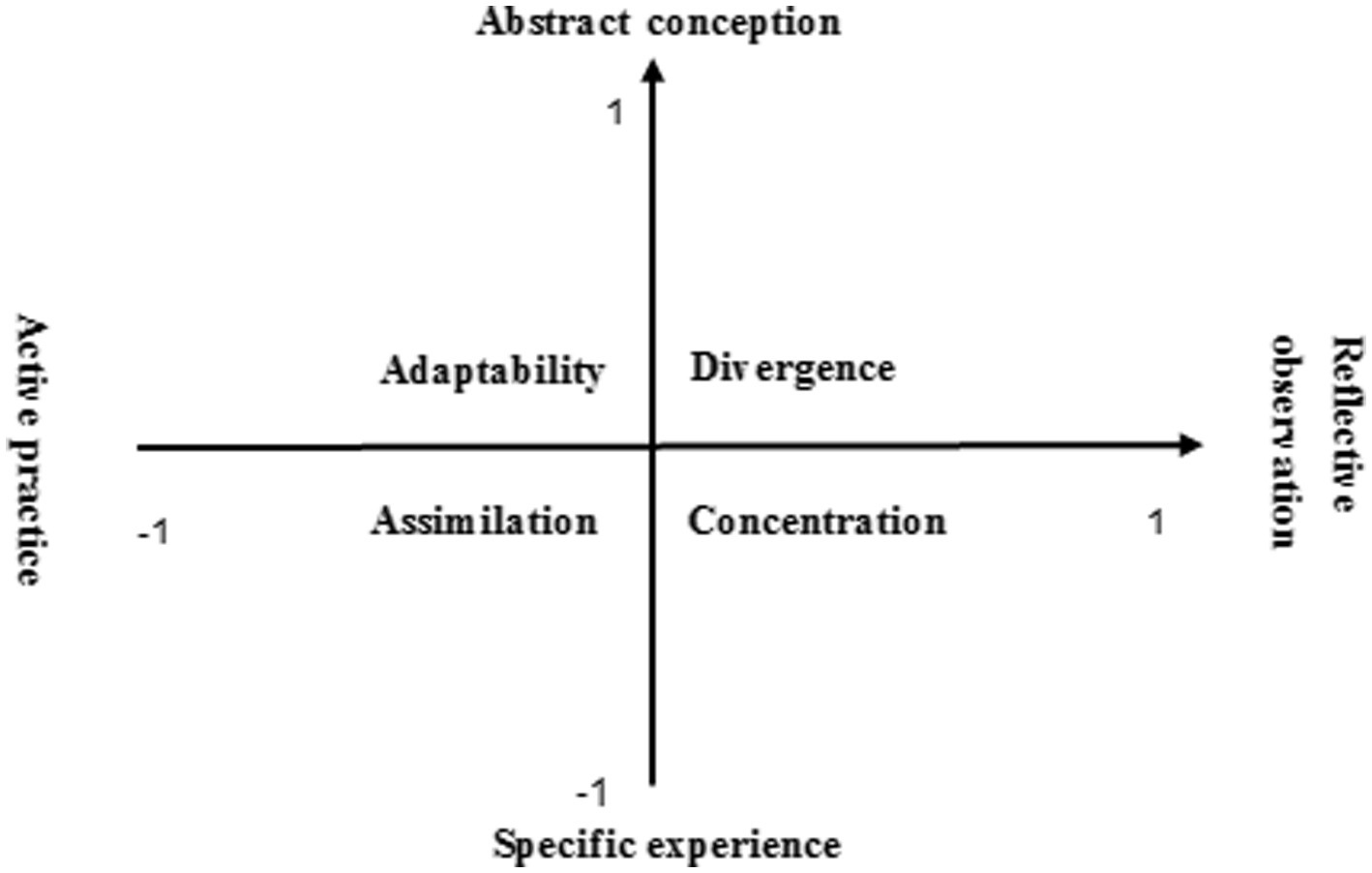 Educator David Kolb put forward the learning style model in 1976. He believed that there were differences in the way each person received learning information in the process of learning activities, which led to the formation of a unique learning style, mainly embodied in two aspects, namely, perception and information processing. The dimension of perception mode includes two directions, namely, “collective experience” and “abstract concept” (concrete perception and abstract perception), which reflects the individual’s preference for understanding the environment and acquiring experience. The dimension of information processing includes two directions, namely, “subject practice” and “reflective observation” (two kinds of processing activities, i.e., positive action and reflection summary), which reflects the differences in the way individuals process or transform information when receiving information. Combining these two dimensions, we can get a model that reflects the individual learning style, generating four types of learning styles, namely, divergent, assimilative, centralized, and adaptive (as shown in Figure 1).