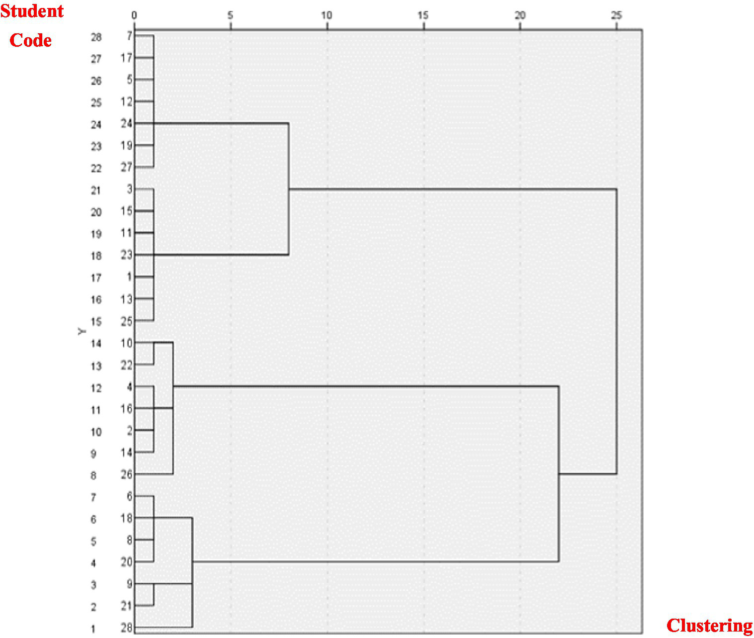The SPSS software is used to cluster the data, and the results are shown in Figure 2. Four online learning communities (K = 4) are preliminarily constructed. According to the pedigree diagram, the online learning community was preliminarily constructed, and C1: A7, A17, A5, A12, A24, A19, A27 were obtained; C2: A3, A15, A11, A23, A1, A13, A25; C3: A10, A22, A4, A16, A2, A14, A26; C4: A6, A18, A8, A20, A9, A21, A28 and other four online learning communities, at this time, the number of clusters is equal and the internal homogeneity, thus, any cluster can be combined. Here, take C1 (the number of clusters is equal, which can be taken arbitrarily) to generate seven new clusters: C11: A7, C12: A17, C13: A5, C14: A12, C15: A24, C16: A19, C17: A27, one learner is selected from other clusters for merging, and finally seven learning communities are formed. The results are shown in Table 3. In cluster construction, the number of members in the online learning community is the same, and the average style vector (i.e., the average value of the group’s learners’ preferences on the two dimensions) is close, indicating that the construction method ensures homogeneity between groups. At the same time, comparing the learning styles of each member of the community, there are significant differences, indicating that there is heterogeneity within the group. In the random construction method, the number of community members varies greatly, and the overall average style does not fully control the homogeneity. There are no significant differences among the members of the community, and their learning styles are relatively similar.