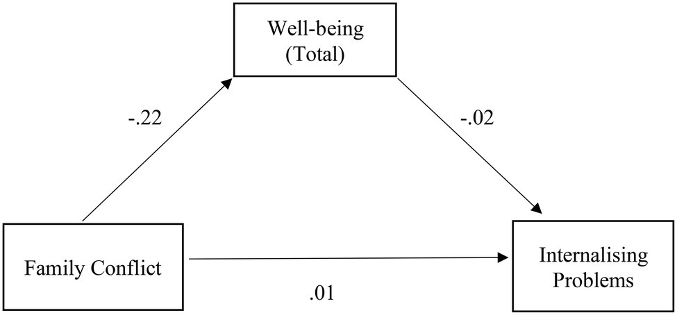 Illustration of the direct effects of the family conflict for internalizing problems through the mediator well-being in clinical group. The represented coefficients are standardized. Total effect (β = 0.01, p > 0.05).